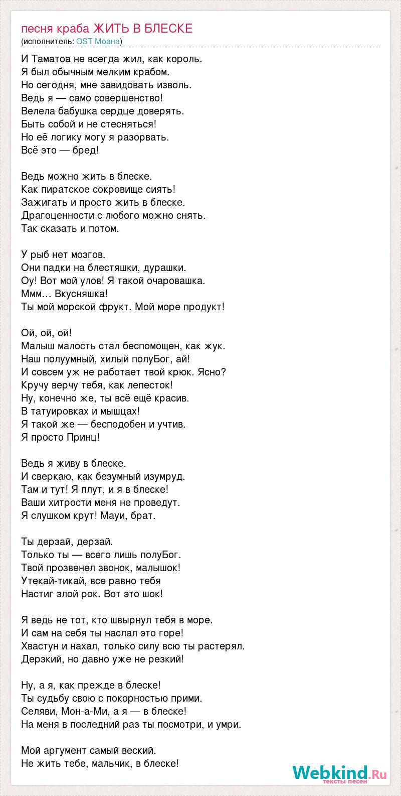 И Таматоа не всегда жил, как король. Я был обычным мелким крабом. Но сегодня, мне завидовать изволь. Ведь я — само совершенство! Велела бабушка сердце доверять. Быть собой и не стесняться! Но её логику могу я разорвать. Всё это — бред! Ведь можно жить в блеске. Как пиратское сокровище сиять! Зажигать и просто жить в блеске. Драгоценности с любого можно снять. Так сказать и потом. У рыб нет мозгов. Они падки на блестяшки, дурашки. Оу! Вот мой улов! Я такой очаровашка. Ммм… Вкусняшка! Ты мой морской фрукт. Мой море продукт! Ой, ой, ой! Малыш малость стал беспомощен, как жук. Наш полуумный, хилый полуБог, ай! И совсем уж не работает твой крюк. Ясно? Кручу верчу тебя, как лепесток! Ну, конечно же, ты всё ещё красив. В татуировках и мышцах! Я такой же — бесподобен и учтив. Я просто Принц! Ведь я живу в блеске. И сверкаю, как безумный изумруд. Там и тут! Я плут, и я в блеске! Ваши хитрости меня не проведут. Я слушком крут! Мауи, брат. Ты дерзай, дерзай. Только ты — всего лишь полуБог. Твой прозвенел звонок, малышок! Утекай-тикай, все равно тебя Настиг злой рок. Вот это шок! Я ведь не тот, кто швырнул тебя в море. И сам на себя ты наслал это горе! Хвастун и нахал, только силу всю ты растерял. Дерзкий, но давно уже не резкий! Ну, а я, как прежде в блеске! Ты судьбу свою с покорностью прими. Селяви, Мон-а-Ми, а я — в блеске! На меня в последний раз ты посмотри, и умри. Мой аргумент самый веский. Не жить тебе, мальчик, в блеске!