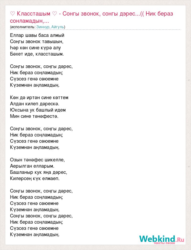 Еллар шавы баса алмый Соңгы звонок тавышын, Һәр көн сине күрә алу Бәхет иде, классташым. Соңгы звонок, соңгы дәрес, Ник бераз соңламадың; Сүзсез генә сөюемне Күземнән аңламадың. Көн дә иртән сине көттем Алдан килеп дәрескә. Юксына ук башлый идем Мин сине тәнәфестә. Соңгы звонок, соңгы дәрес, Ник бераз соңламадың; Сүзсез генә сөюемне Күземнән аңламадың. Озын тәнәфес шикелле, Аерылган елларым. Башланыр кук яңа дәрес, Килерсең күк елмаеп. Соңгы звонок, соңгы дәрес, Ник бераз соңламадың; Сүзсез генә сөюемне Күземнән аңламадың. Соңгы звонок, соңгы дәрес, Ник бераз соңламадың; Сүзсез генә сөюемне Күземнән аңламадың.