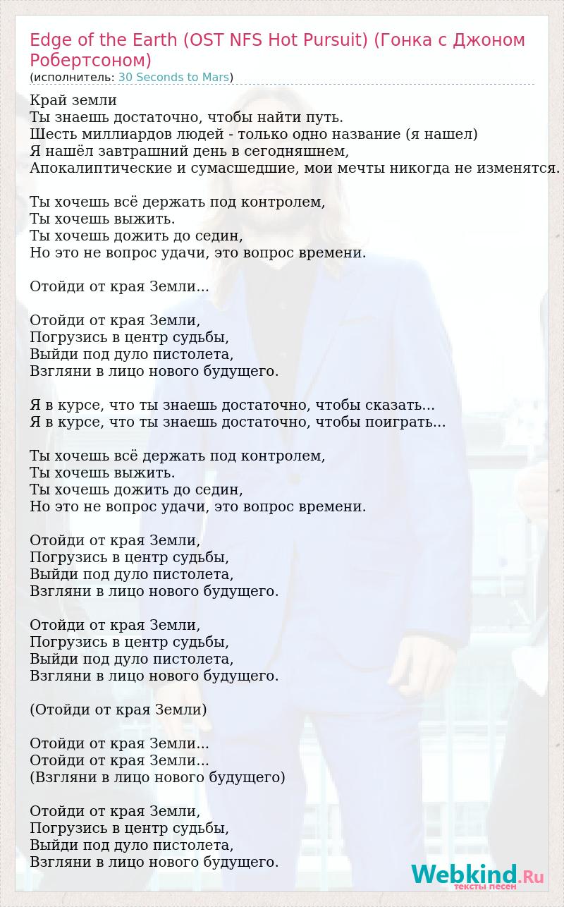 Главная→Исполнители→30 Seconds to Mars→Edge of the Earth (OST NFS Hot Pursuit) (Гонка с Джоном Робертсоном)