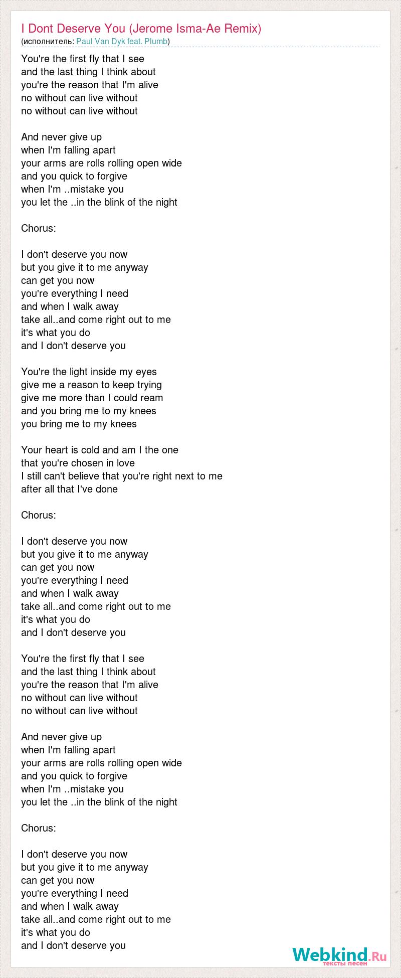 You're the first fly that I see and the last thing I think about you're the reason that I'm alive no without can live without no without can live without And never give up when I'm falling apart your arms are rolls rolling open wide and you quick to forgive when I'm ..mistake you you let the ..in the blink of the night Chorus: I don't deserve you now but you give it to me anyway can get you now you're everything I need and when I walk away take all..and come right out to me it's what you do and I don't deserve you You're the light inside my eyes give me a reason to keep trying give me more than I could ream and you bring me to my knees you bring me to my knees Your heart is cold and am I the one that you're chosen in love I still can't believe that you're right next to me after all that I've done Chorus: I don't deserve you now but you give it to me anyway can get you now you're everything I need and when I walk away take all..and come right out to me it's what you do and I don't deserve you You're the first fly that I see and the last thing I think about you're the reason that I'm alive no without can live without no without can live without And never give up when I'm falling apart your arms are rolls rolling open wide and you quick to forgive when I'm ..mistake you you let the ..in the blink of the night Chorus: I don't deserve you now but you give it to me anyway can get you now you're everything I need and when I walk away take all..and come right out to me it's what you do and I don't deserve you