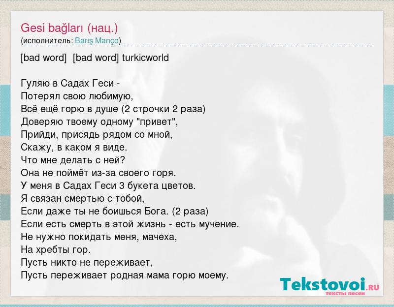 [bad word] [bad word] turkicworld Гуляю в Садах Геси - Потерял свою любимую, Всё ещё горю в душе (2 строчки 2 раза) Доверяю твоему одному "привет", Прийди, присядь рядом со мной, Скажу, в каком я виде. Что мне делать с ней? Она не поймёт из-за своего горя. У меня в Садах Геси 3 букета цветов. Я связан смертью с тобой, Если даже ты не боишься Бога. (2 раза) Если есть смерть в этой жизнь - есть мучение. Не нужно покидать меня, мачеха, На хребты гор. Пусть никто не переживает, Пусть переживает родная мама горю моему.