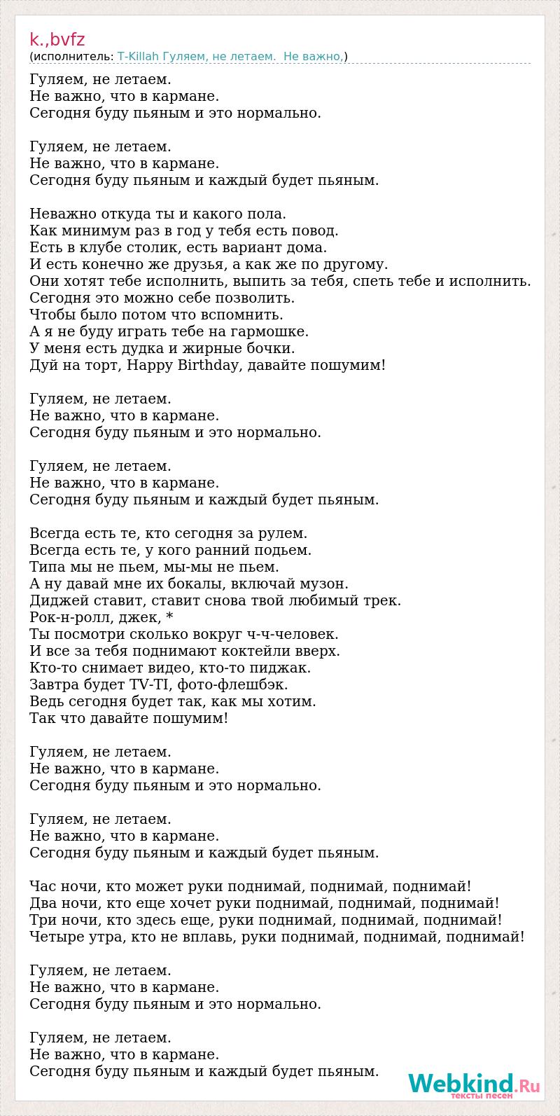 Гуляем, не летаем. Не важно, что в кармане. Сегодня буду пьяным и это нормально. Гуляем, не летаем. Не важно, что в кармане. Сегодня буду пьяным и каждый будет пьяным. Неважно откуда ты и какого пола. Как минимум раз в год у тебя есть повод. Есть в клубе столик, есть вариант дома. И есть конечно же друзья, а как же по другому. Они хотят тебе исполнить, выпить за тебя, спеть тебе и исполнить. Сегодня это можно себе позволить. Чтобы было потом что вспомнить. А я не буду играть тебе на гармошке. У меня есть дудка и жирные бочки. Дуй на торт, Happy Birthday, давайте пошумим! Гуляем, не летаем. Не важно, что в кармане. Сегодня буду пьяным и это нормально. Гуляем, не летаем. Не важно, что в кармане. Сегодня буду пьяным и каждый будет пьяным. Всегда есть те, кто сегодня за рулем. Всегда есть те, у кого ранний подьем. Типа мы не пьем, мы-мы не пьем. А ну давай мне их бокалы, включай музон. Диджей ставит, ставит снова твой любимый трек. Рок-н-ролл, джек, * Ты посмотри сколько вокруг ч-ч-человек. И все за тебя поднимают коктейли вверх. Кто-то снимает видео, кто-то пиджак. Завтра будет TV-TI, фото-флешбэк. Ведь сегодня будет так, как мы хотим. Так что давайте пошумим! Гуляем, не летаем. Не важно, что в кармане. Сегодня буду пьяным и это нормально. Гуляем, не летаем. Не важно, что в кармане. Сегодня буду пьяным и каждый будет пьяным. Час ночи, кто может руки поднимай, поднимай, поднимай! Два ночи, кто еще хочет руки поднимай, поднимай, поднимай! Три ночи, кто здесь еще, руки поднимай, поднимай, поднимай! Четыре утра, кто не вплавь, руки поднимай, поднимай, поднимай! Гуляем, не летаем. Не важно, что в кармане. Сегодня буду пьяным и это нормально. Гуляем, не летаем. Не важно, что в кармане. Сегодня буду пьяным и каждый будет пьяным.