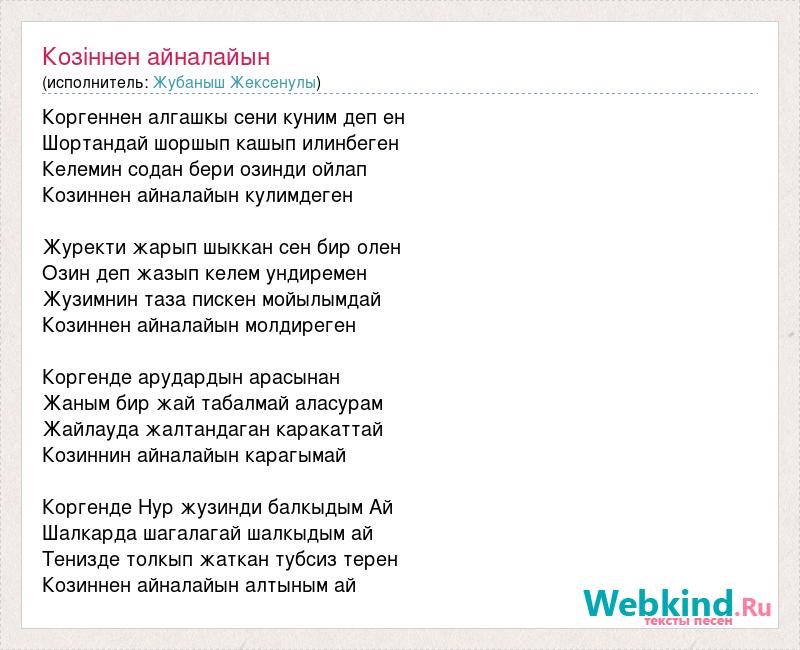 Коргеннен алгашкы сени куним деп ен Шортандай шоршып кашып илинбеген Келемин содан бери озинди ойлап Козиннен айналайын кулимдеген Журекти жарып шыккан сен бир олен Озин деп жазып келем ундиремен Жузимнин таза пискен мойылымдай Козиннен айналайын молдиреген Коргенде арудардын арасынан Жаным бир жай табалмай аласурам Жайлауда жалтандаган каракаттай Козиннин айналайын карагымай Коргенде Нур жузинди балкыдым Ай Шалкарда шагалагай шалкыдым ай Тенизде толкып жаткан тубсиз терен Козиннен айналайын алтыным ай