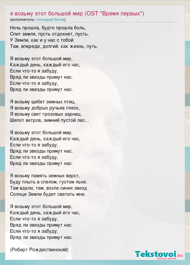 Ночь прошла, будто прошла боль, Спит земля, пусть отдохнет, пусть. У Земли, как и у нас с тобой Там, впереди, долгий, как жизнь, путь. Я возьму этот большой мир, Каждый день, каждый его час, Если что-то я забуду, Вряд ли звезды примут нас. Если что-то я забуду, Вряд ли звезды примут нас. Я возьму щебет земных птиц, Я возьму добрых ручьев плеск, Я возьму свет грозовых зарниц, Шепот ветров, зимний пустой лес... Я возьму этот большой мир, Каждый день, каждый его час, Если что-то я забуду, Вряд ли звезды примут нас. Если что-то я забуду, Вряд ли звезды примут нас. Я возьму память земных верст, Буду плыть в спелом, густом льне. Там вдали, там, возле синих звезд Солнце Земли будет светить мне. Я возьму этот большой мир, Каждый день, каждый его час, Если что-то я забуду, Вряд ли звезды примут нас. Если что-то я забуду, Вряд ли звезды примут нас. (Роберт Рождественский)