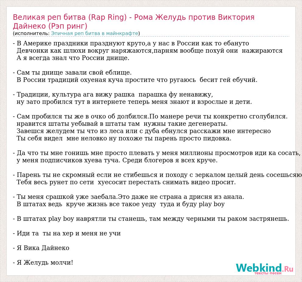 Главная→Исполнители→Эпичная реп битва в майнкрафте→Великая реп битва (Rap Ring) - Рома Желудь против Виктория Дайнеко (Рэп ринг)