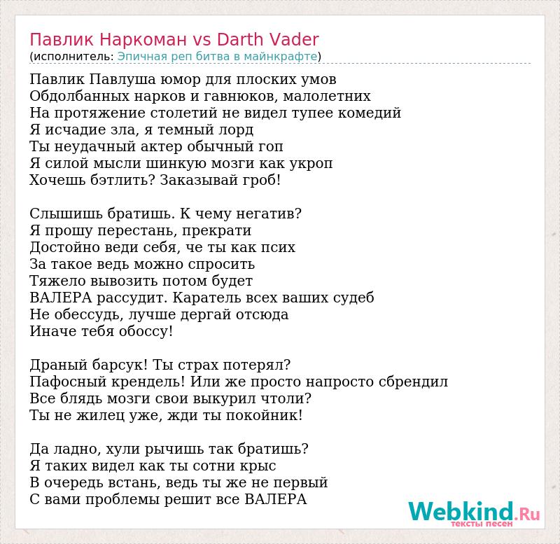 Павлик Павлуша юмор для плоских умов Обдолбанных нарков и гавнюков, малолетних На протяжение столетий не видел тупее комедий Я исчадие зла, я темный лорд Ты неудачный актер обычный гоп Я силой мысли шинкую мозги как укроп Хочешь бэтлить? Заказывай гроб! Слышишь братишь. К чему негатив? Я прошу перестань, прекрати Достойно веди себя, че ты как псих За такое ведь можно спросить Тяжело вывозить потом будет ВАЛЕРА рассудит. Каратель всех ваших судеб Не обессудь, лучше дергай отсюда Иначе тебя обоссу! Драный барсук! Ты страх потерял? Пафосный крендель! Или же просто напросто сбрендил Все блядь мозги свои выкурил чтоли? Ты не жилец уже, жди ты покойник! Да ладно, хули рычишь так братишь? Я таких видел как ты сотни крыс В очередь встань, ведь ты же не первый С вами проблемы решит все ВАЛЕРА