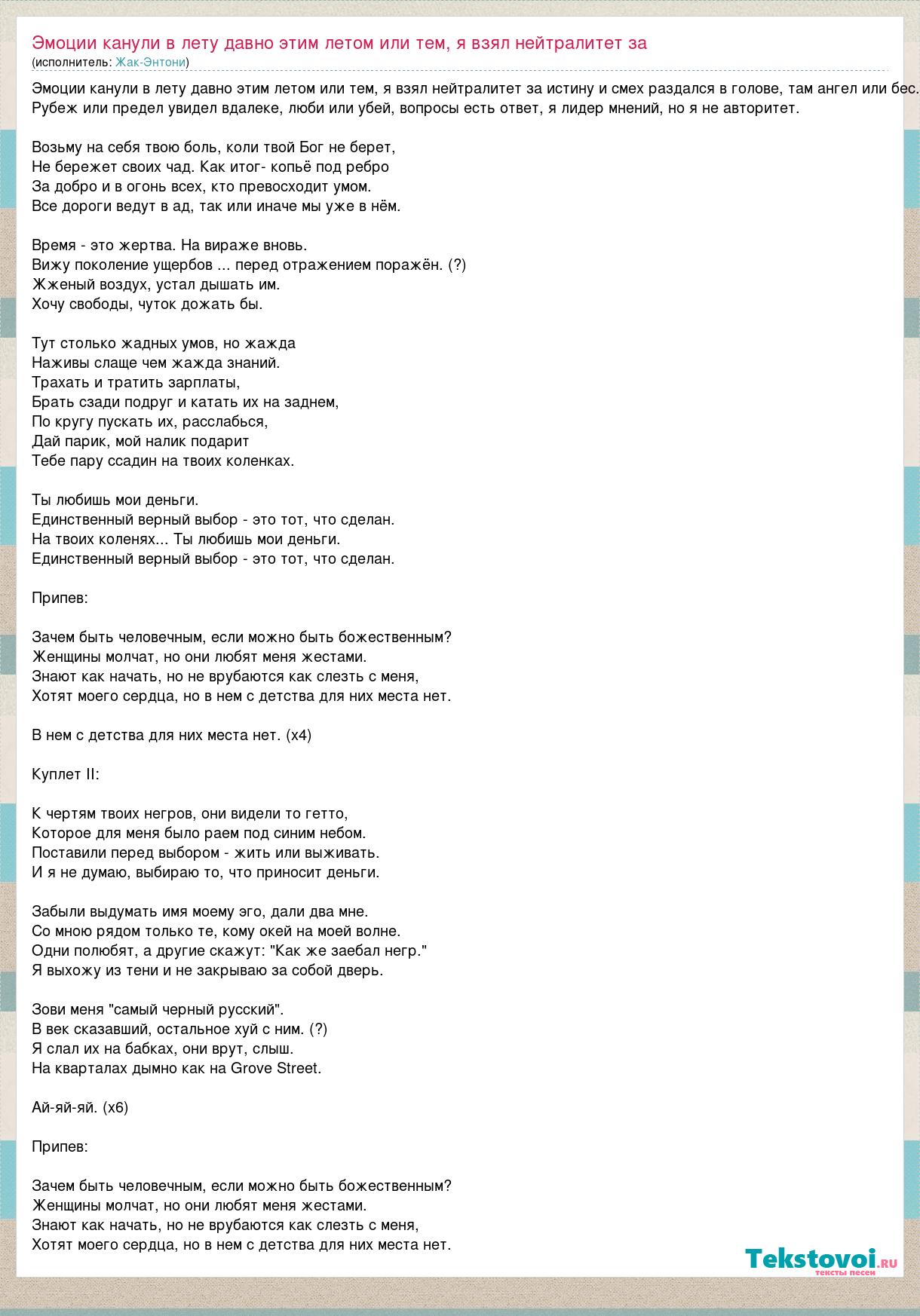 Эмоции канули в лету давно этим летом или тем, я взял нейтралитет за истину и смех раздался в голове, там ангел или бес. Рубеж или предел увидел вдалеке, люби или убей, вопросы есть ответ, я лидер мнений, но я не авторитет. Возьму на себя твою боль, коли твой Бог не берет, Не бережет своих чад. Как итог- копьё под ребро За добро и в огонь всех, кто превосходит умом. Все дороги ведут в ад, так или иначе мы уже в нём. Время - это жертва. На вираже вновь. Вижу поколение ущербов ... перед отражением поражён. (?) Жженый воздух, устал дышать им. Хочу свободы, чуток дожать бы. Тут столько жадных умов, но жажда Наживы слаще чем жажда знаний. Трахать и тратить зарплаты, Брать сзади подруг и катать их на заднем, По кругу пускать их, расслабься, Дай парик, мой налик подарит Тебе пару ссадин на твоих коленках. Ты любишь мои деньги. Единственный верный выбор - это тот, что сделан. На твоих коленях... Ты любишь мои деньги. Единственный верный выбор - это тот, что сделан. Припев: Зачем быть человечным, если можно быть божественным? Женщины молчат, но они любят меня жестами. Знают как начать, но не врубаются как слезть с меня, Хотят моего сердца, но в нем с детства для них места нет. В нем с детства для них места нет. (х4) Куплет II: К чертям твоих негров, они видели то гетто, Которое для меня было раем под синим небом. Поставили перед выбором - жить или выживать. И я не думаю, выбираю то, что приносит деньги. Забыли выдумать имя моему эго, дали два мне. Со мною рядом только те, кому окей на моей волне. Одни полюбят, а другие скажут: "Как же заебал негр." Я выхожу из тени и не закрываю за собой дверь. Зови меня "самый черный русский". В век сказавший, остальное хуй с ним. (?) Я слал их на бабках, они врут, слыш. На кварталах дымно как на Grove Street. Ай-яй-яй. (х6) Припев: Зачем быть человечным, если можно быть божественным? Женщины молчат, но они любят меня жестами. Знают как начать, но не врубаются как слезть с меня, Хотят моего сердца, но в нем с детства для них места нет.
