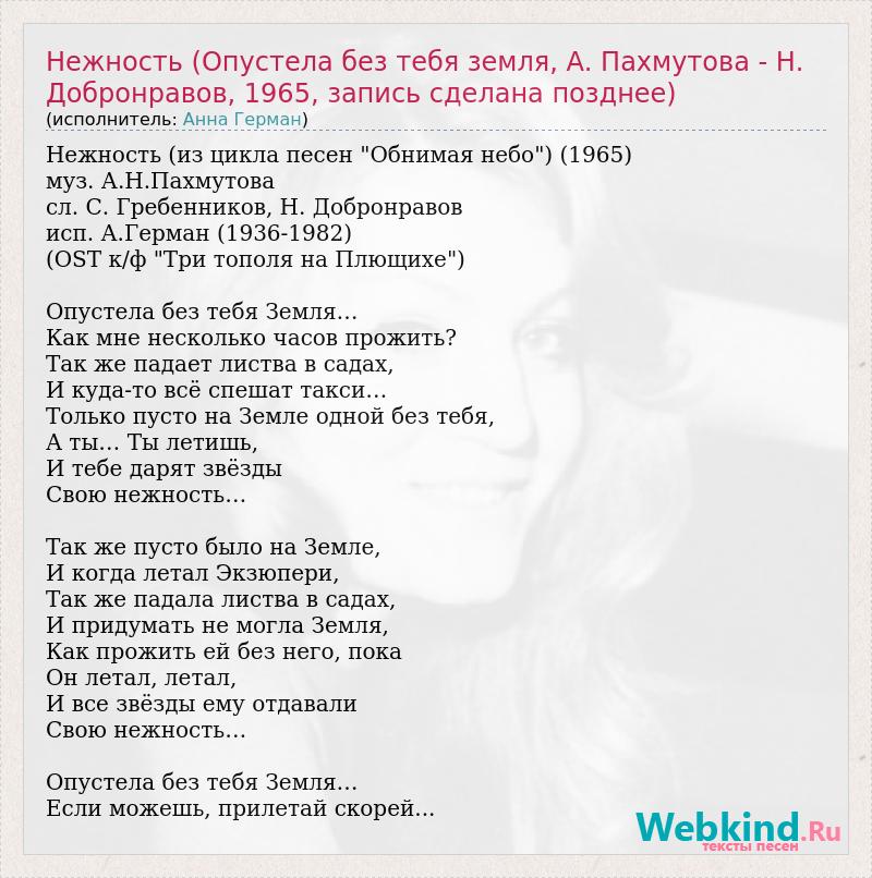 Нежность (из цикла песен "Обнимая небо") (1965) муз. А.Н.Пахмутова сл. С. Гребенников, Н. Добронравов исп. А.Герман (1936-1982) (OST к/ф "Три тополя на Плющихе") Опустела без тебя Земля… Как мне несколько часов прожить? Так же падает листва в садах, И куда-то всё спешат такси… Только пусто на Земле одной без тебя, А ты… Ты летишь, И тебе дарят звёзды Свою нежность… Так же пусто было на Земле, И когда летал Экзюпери, Так же падала листва в садах, И придумать не могла Земля, Как прожить ей без него, пока Он летал, летал, И все звёзды ему отдавали Свою нежность… Опустела без тебя Земля… Если можешь, прилетай скорей...