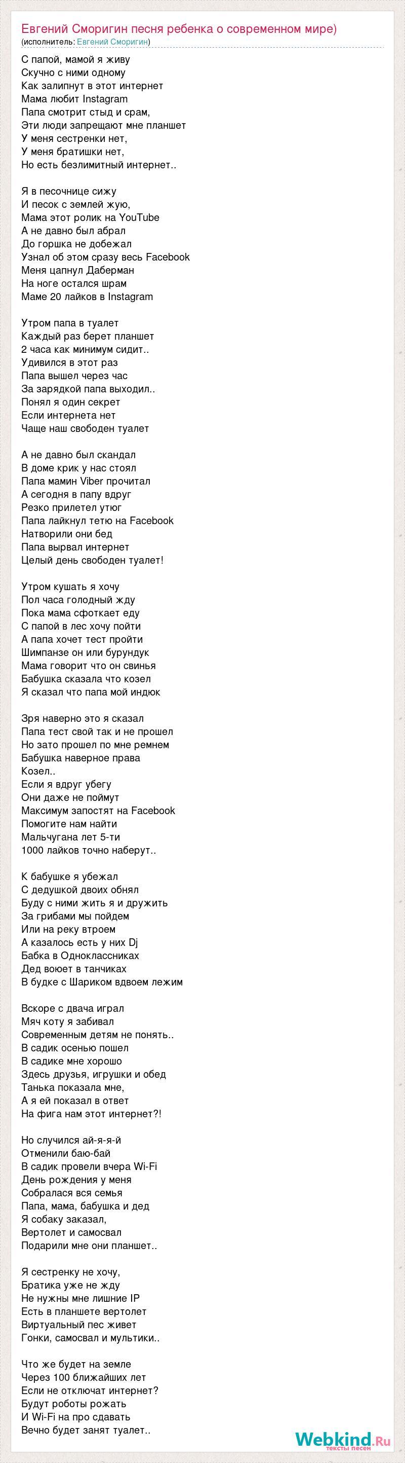 С папой, мамой я живу Скучно с ними одному Как залипнут в этот интернет Мама любит Instagram Папа смотрит стыд и срам, Эти люди запрещают мне планшет У меня сестренки нет, У меня братишки нет, Но есть безлимитный интернет.. Я в песочнице сижу И песок с землей жую, Мама этот ролик на YouTube А не давно был абрал До горшка не добежал Узнал об этом сразу весь Facebook Меня цапнул Даберман На ноге остался шрам Маме 20 лайков в Instagram Утром папа в туалет Каждый раз берет планшет 2 часа как минимум сидит.. Удивился в этот раз Папа вышел через час За зарядкой папа выходил.. Понял я один секрет Если интернета нет Чаще наш свободен туалет А не давно был скандал В доме крик у нас стоял Папа мамин Viber прочитал А сегодня в папу вдруг Резко прилетел утюг Папа лайкнул тетю на Facebook Натворили они бед Папа вырвал интернет Целый день свободен туалет! Утром кушать я хочу Пол часа голодный жду Пока мама сфоткает еду С папой в лес хочу пойти А папа хочет тест пройти Шимпанзе он или бурундук Мама говорит что он свинья Бабушка сказала что козел Я сказал что папа мой индюк Зря наверно это я сказал Папа тест свой так и не прошел Но зато прошел по мне ремнем Бабушка наверное права Козел.. Если я вдруг убегу Они даже не поймут Максимум запостят на Facebook Помогите нам найти Мальчугана лет 5-ти 1000 лайков точно наберут.. К бабушке я убежал С дедушкой двоих обнял Буду с ними жить я и дружить За грибами мы пойдем Или на реку втроем А казалось есть у них Dj Бабка в Одноклассниках Дед воюет в танчиках В будке с Шариком вдвоем лежим Вскоре с двача играл Мяч коту я забивал Современным детям не понять.. В садик осенью пошел В садике мне хорошо Здесь друзья, игрушки и обед Танька показала мне, А я ей показал в ответ На фига нам этот интернет?! Но случился ай-я-я-й Отменили баю-бай В садик провели вчера Wi-Fi День рождения у меня Собралася вся семья Папа, мама, бабушка и дед Я собаку заказал, Вертолет и самосвал Подарили мне они планшет.. Я сестренку не хочу, Братика уже не жду Не нужны мне лишние IP Есть в планшете вертолет Виртуальный пес живет Гонки, самосвал и мультики.. Что же будет на земле Через 100 ближайших лет Если не отключат интернет? Будут роботы рожать И Wi-Fi на про сдавать Вечно будет занят туалет..