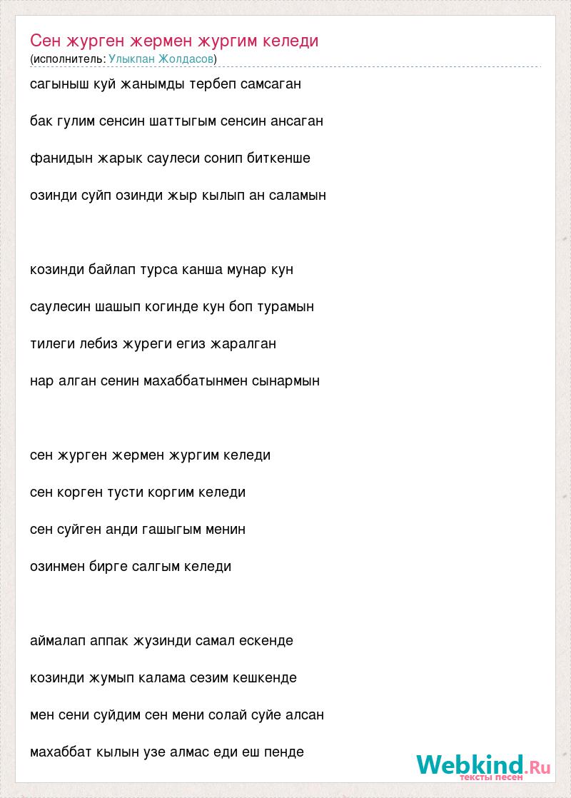 сагыныш куй жанымды тербеп самсаган бак гулим сенсин шаттыгым сенсин ансаган фанидын жарык саулеси сонип биткенше озинди суйп озинди жыр кылып ан саламын козинди байлап турса канша мунар кун саулесин шашып когинде кун боп турамын тилеги лебиз журеги егиз жаралган нар алган сенин махаббатынмен сынармын сен журген жермен жургим келеди сен корген тусти коргим келеди сен суйген анди гашыгым менин озинмен бирге салгым келеди аймалап аппак жузинди самал ескенде козинди жумып калама сезим кешкенде мен сени суйдим сен мени солай суйе алсан махаббат кылын узе алмас еди еш пенде