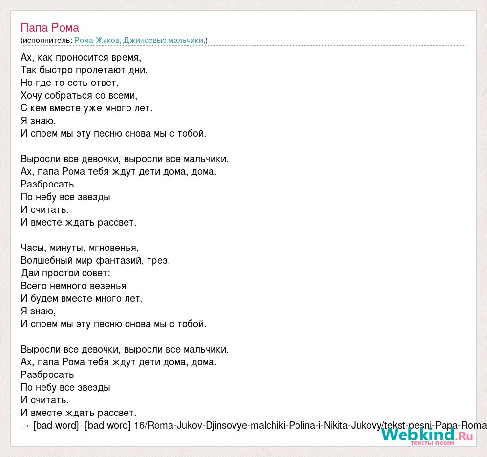 Ах, как проносится время, Так быстро пролетают дни. Но где то есть ответ, Хочу собраться со всеми, С кем вместе уже много лет. Я знаю, И споем мы эту песню снова мы с тобой. Выросли все девочки, выросли все мальчики. Ах, папа Рома тебя ждут дети дома, дома. Разбросать По небу все звезды И считать. И вместе ждать рассвет. Часы, минуты, мгновенья, Волшебный мир фантазий, грез. Дай простой совет: Всего немного везенья И будем вместе много лет. Я знаю, И споем мы эту песню снова мы с тобой. Выросли все девочки, выросли все мальчики. Ах, папа Рома тебя ждут дети дома, дома. Разбросать По небу все звезды И считать. И вместе ждать рассвет. → [bad word] [bad word] 16/Roma-Jukov-Djinsovye-malchiki-Polina-i-Nikita-Jukovy/tekst-pesni-Papa-Roma