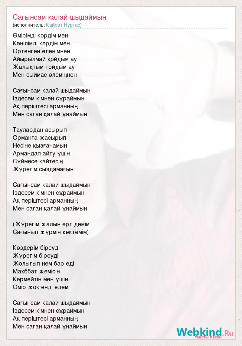Өмірімді көрдім мен Көңілімді көрдім мен Өртенген өлеңімнен Айырылмай қойдым ау Жалықтым тойдым ау Мен сыймас әлеміңнен Сағынсам қалай шыдаймын Іздесем кімнен сұраймын Ақ періштесі арманның Мен саған қалай ұнаймын Таулардан асырып Орманға жасырып Несіне қызғанамын Армандап айту үшін Сүймесе қайтесің Жүрегім сыздамағын Сағынсам қалай шыдаймын Іздесем кімнен сұраймын Ақ періштесі арманның Мен саған қалай ұнаймын (Жүрегім жалын өрт демім Сағынып жүрмін көктемім) Көздерім біреуді Жүрегім біреуді Жолығып нем бар еді Махббат жемісін Көрмейтін мен үшін Өмір жоқ енді әдемі Сағынсам қалай шыдаймын Іздесем кімнен сұраймын Ақ періштесі арманның Мен саған қалай ұнаймын