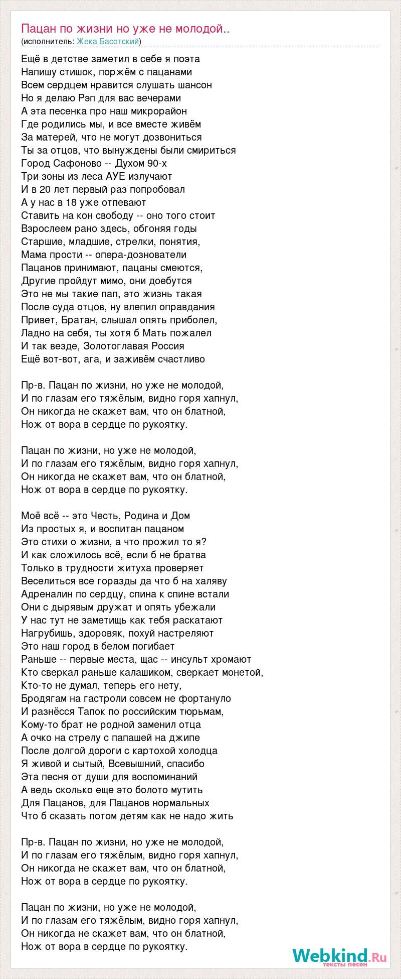 Ещё в детстве заметил в себе я поэта Напишу стишок, поржём с пацанами Всем сердцем нравится слушать шансон Но я делаю Рэп для вас вечерами А эта песенка про наш микрорайон Где родились мы, и все вместе живём За матерей, что не могут дозвониться Ты за отцов, что вынуждены были смириться Город Сафоново -- Духом 90-х Три зоны из леса АУЕ излучают И в 20 лет первый раз попробовал А у нас в 18 уже отпевают Ставить на кон свободу -- оно того стоит Взрослеем рано здесь, обгоняя годы Старшие, младшие, стрелки, понятия, Мама прости -- опера-дознователи Пацанов принимают, пацаны смеются, Другие пройдут мимо, они доебутся Это не мы такие пап, это жизнь такая После суда отцов, ну влепил оправдания Привет, Братан, слышал опять приболел, Ладно на себя, ты хотя б Мать пожалел И так везде, Золотоглавая Россия Ещё вот-вот, ага, и заживём счастливо Пр-в. Пацан по жизни, но уже не молодой, И по глазам его тяжёлым, видно горя хапнул, Он никогда не скажет вам, что он блатной, Нож от вора в сердце по рукоятку. Пацан по жизни, но уже не молодой, И по глазам его тяжёлым, видно горя хапнул, Он никогда не скажет вам, что он блатной, Нож от вора в сердце по рукоятку. Моё всё -- это Честь, Родина и Дом Из простых я, и воспитан пацаном Это стихи о жизни, а что прожил то я? И как сложилось всё, если б не братва Только в трудности житуха проверяет Веселиться все горазды да что б на халяву Адреналин по сердцу, спина к спине встали Они с дырявым дружат и опять убежали У нас тут не заметищь как тебя раскатают Нагрубишь, здоровяк, похуй настреляют Это наш город в белом погибает Раньше -- первые места, щас -- инсульт хромают Кто сверкал раньше калашиком, сверкает монетой, Кто-то не думал, теперь его нету, Бродягам на гастроли совсем не фортануло И разнёсся Тапок по российским тюрьмам, Кому-то брат не родной заменил отца А очко на стрелу с папашей на джипе После долгой дороги с картохой холодца Я живой и сытый, Всевышний, спасибо Эта песня от души для воспоминаний А ведь сколько еще это болото мутить Для Пацанов, для Пацанов нормальных Что б сказать потом детям как не надо жить Пр-в. Пацан по жизни, но уже не молодой, И по глазам его тяжёлым, видно горя хапнул, Он никогда не скажет вам, что он блатной, Нож от вора в сердце по рукоятку. Пацан по жизни, но уже не молодой, И по глазам его тяжёлым, видно горя хапнул, Он никогда не скажет вам, что он блатной, Нож от вора в сердце по рукоятку.
