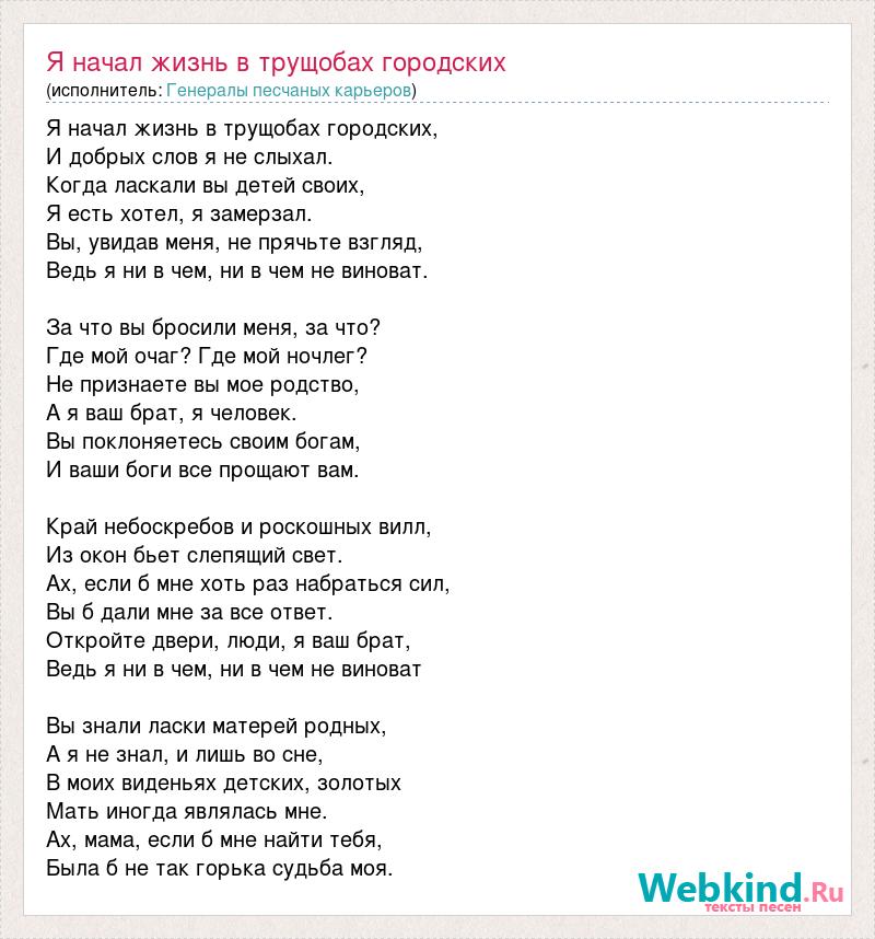 Я начал жизнь в трущобах городских, И добрых слов я не слыхал. Когда ласкали вы детей своих, Я есть хотел, я замерзал. Вы, увидав меня, не прячьте взгляд, Ведь я ни в чем, ни в чем не виноват. За что вы бросили меня, за что? Где мой очаг? Где мой ночлег? Не признаете вы мое родство, А я ваш брат, я человек. Вы поклоняетесь своим богам, И ваши боги все прощают вам. Край небоскребов и роскошных вилл, Из окон бьет слепящий свет. Ах, если б мне хоть раз набраться сил, Вы б дали мне за все ответ. Откройте двери, люди, я ваш брат, Ведь я ни в чем, ни в чем не виноват Вы знали ласки матерей родных, А я не знал, и лишь во сне, В моих виденьях детских, золотых Мать иногда являлась мне. Ах, мама, если б мне найти тебя, Была б не так горька судьба моя.