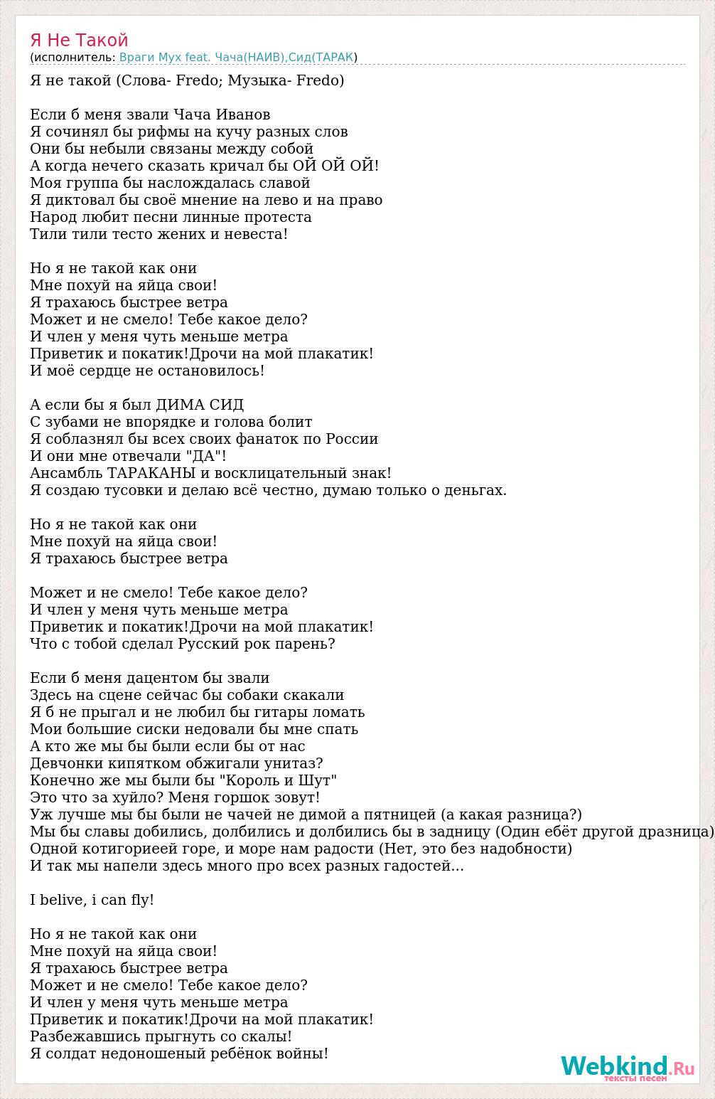 Я не такой (Слова- Fredo; Музыка- Fredo) Если б меня звали Чача Иванов Я сочинял бы рифмы на кучу разных слов Они бы небыли связаны между собой А когда нечего сказать кричал бы ОЙ ОЙ ОЙ! Моя группа бы наслождалась славой Я диктовал бы своё мнение на лево и на право Народ любит песни линные протеста Тили тили тесто жених и невеста! Но я не такой как они Мне похуй на яйца свои! Я трахаюсь быстрее ветра Может и не смело! Тебе какое дело? И член у меня чуть меньше метра Приветик и покатик!Дрочи на мой плакатик! И моё сердце не остановилось! А если бы я был ДИМА СИД С зубами не впорядке и голова болит Я соблазнял бы всех своих фанаток по России И они мне отвечали "ДА"! Ансамбль ТАРАКАНЫ и восклицательный знак! Я создаю тусовки и делаю всё честно, думаю только о деньгах. Но я не такой как они Мне похуй на яйца свои! Я трахаюсь быстрее ветра Может и не смело! Тебе какое дело? И член у меня чуть меньше метра Приветик и покатик!Дрочи на мой плакатик! Что с тобой сделал Русский рок парень? Если б меня дацентом бы звали Здесь на сцене сейчас бы собаки скакали Я б не прыгал и не любил бы гитары ломать Мои большие сиски недовали бы мне спать А кто же мы бы были если бы от нас Девчонки кипятком обжигали унитаз? Конечно же мы были бы "Король и Шут" Это что за хуйло? Меня горшок зовут! Уж лучше мы бы были не чачей не димой а пятницей (а какая разница?) Мы бы славы добились, долбились и долбились бы в задницу (Один ебёт другой дразница) Одной котигориеей горе, и море нам радости (Нет, это без надобности) И так мы напели здесь много про всех разных гадостей... I belive, i can fly! Но я не такой как они Мне похуй на яйца свои! Я трахаюсь быстрее ветра Может и не смело! Тебе какое дело? И член у меня чуть меньше метра Приветик и покатик!Дрочи на мой плакатик! Разбежавшись прыгнуть со скалы! Я солдат недоношеный ребёнок войны!