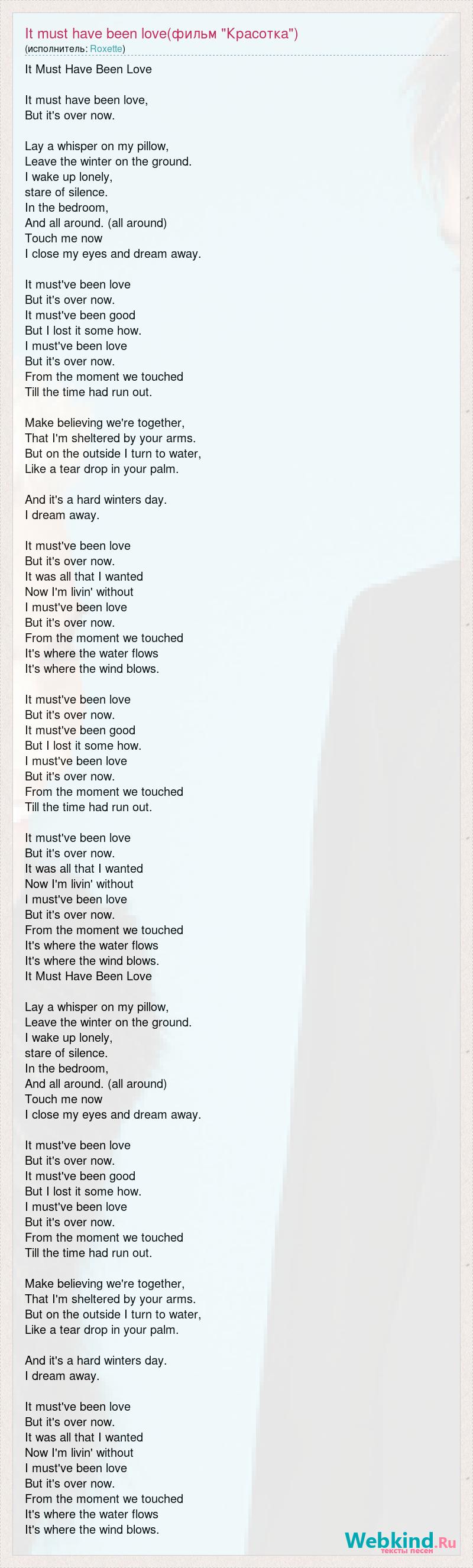 It Must Have Been Love It must have been love, But it's over now. Lay a whisper on my pillow, Leave the winter on the ground. I wake up lonely, stare of silence. In the bedroom, And all around. (all around) Touch me now I close my eyes and dream away. It must've been love But it's over now. It must've been good But I lost it some how. I must've been love But it's over now. From the moment we touched Till the time had run out. Make believing we're together, That I'm sheltered by your arms. But on the outside I turn to water, Like a tear drop in your palm. And it's a hard winters day. I dream away. It must've been love But it's over now. It was all that I wanted Now I'm livin' without I must've been love But it's over now. From the moment we touched It's where the water flows It's where the wind blows. It must've been love But it's over now. It must've been good But I lost it some how. I must've been love But it's over now. From the moment we touched Till the time had run out. It must've been love But it's over now. It was all that I wanted Now I'm livin' without I must've been love But it's over now. From the moment we touched It's where the water flows It's where the wind blows. It Must Have Been Love Lay a whisper on my pillow, Leave the winter on the ground. I wake up lonely, stare of silence. In the bedroom, And all around. (all around) Touch me now I close my eyes and dream away. It must've been love But it's over now. It must've been good But I lost it some how. I must've been love But it's over now. From the moment we touched Till the time had run out. Make believing we're together, That I'm sheltered by your arms. But on the outside I turn to water, Like a tear drop in your palm. And it's a hard winters day. I dream away. It must've been love But it's over now. It was all that I wanted Now I'm livin' without I must've been love But it's over now. From the moment we touched It's where the water flows It's where the wind blows.