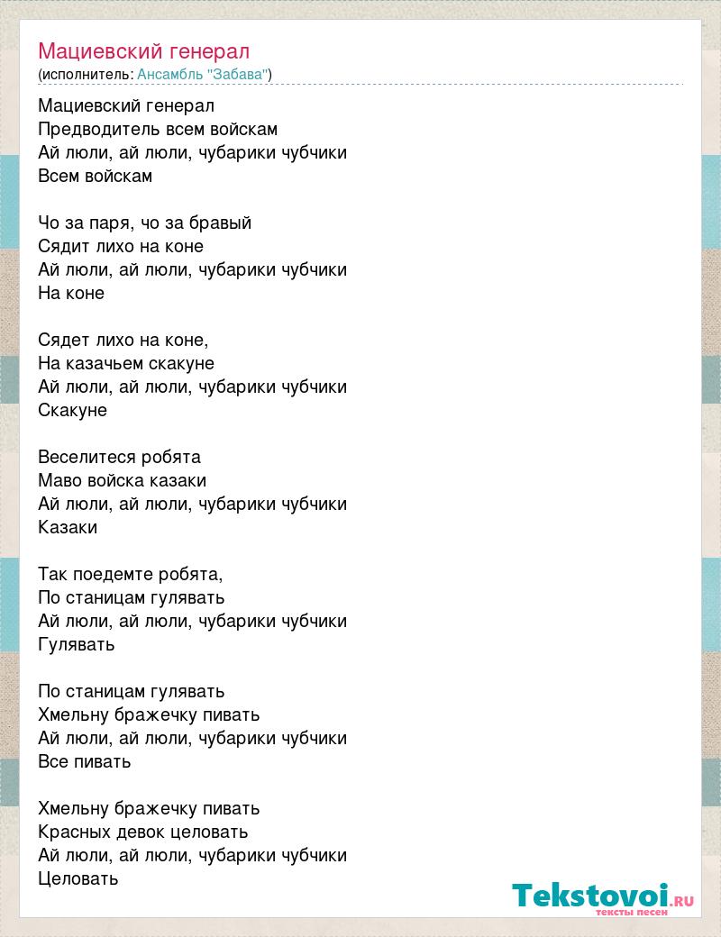 Мациевский генерал Предводитель всем войскам Ай люли, ай люли, чубарики чубчики Всем войскам Чо за паря, чо за бравый Сядит лихо на коне Ай люли, ай люли, чубарики чубчики На коне Сядет лихо на коне, На казачьем скакуне Ай люли, ай люли, чубарики чубчики Скакуне Веселитеся робята Маво войска казаки Ай люли, ай люли, чубарики чубчики Казаки Так поедемте робята, По станицам гулявать Ай люли, ай люли, чубарики чубчики Гулявать По станицам гулявать Хмельну бражечку пивать Ай люли, ай люли, чубарики чубчики Все пивать Хмельну бражечку пивать Красных девок целовать Ай люли, ай люли, чубарики чубчики Целовать