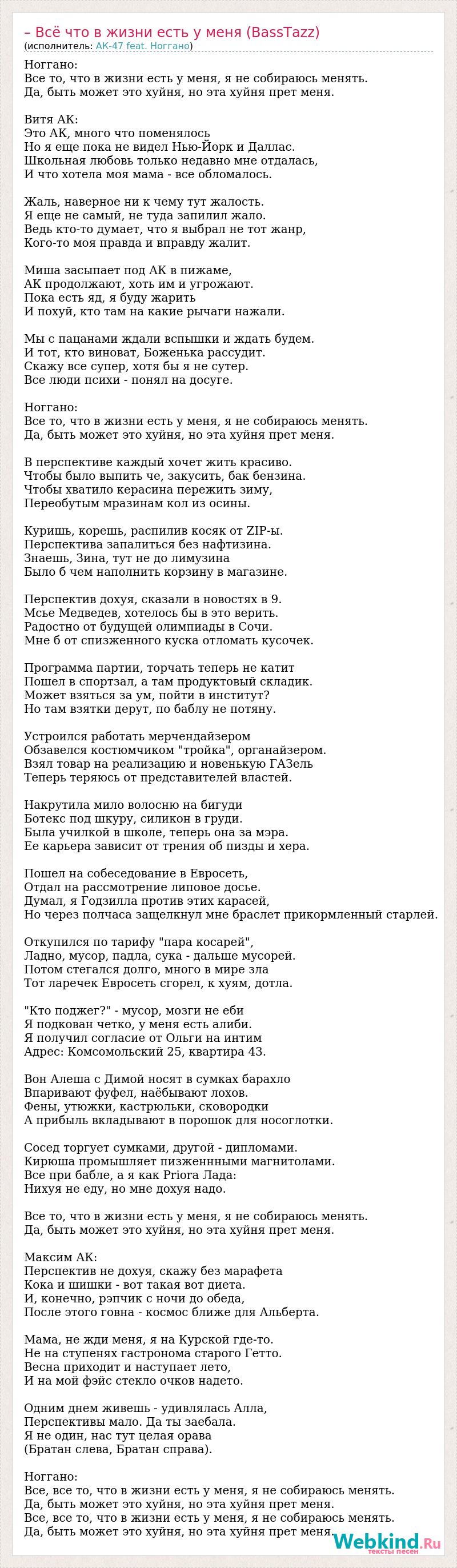 Ноггано: Все то, что в жизни есть у меня, я не собираюсь менять. Да, быть может это хуйня, но эта хуйня прет меня. Витя АК: Это АК, много что поменялось Но я еще пока не видел Нью-Йорк и Даллас. Школьная любовь только недавно мне отдалась, И что хотела моя мама - все обломалось. Жаль, наверное ни к чему тут жалость. Я еще не самый, не туда запилил жало. Ведь кто-то думает, что я выбрал не тот жанр, Кого-то моя правда и вправду жалит. Миша засыпает под АК в пижаме, АК продолжают, хоть им и угрожают. Пока есть яд, я буду жарить И похуй, кто там на какие рычаги нажали. Мы с пацанами ждали вспышки и ждать будем. И тот, кто виноват, Боженька рассудит. Скажу все супер, хотя бы я не сутер. Все люди психи - понял на досуге. Ноггано: Все то, что в жизни есть у меня, я не собираюсь менять. Да, быть может это хуйня, но эта хуйня прет меня. В перспективе каждый хочет жить красиво. Чтобы было выпить че, закусить, бак бензина. Чтобы хватило керасина пережить зиму, Переобутым мразинам кол из осины. Куришь, корешь, распилив косяк от ZIP-ы. Перспектива запалиться без нафтизина. Знаешь, Зина, тут не до лимузина Было б чем наполнить корзину в магазине. Перспектив дохуя, сказали в новостях в 9. Мсье Медведев, хотелось бы в это верить. Радостно от будущей олимпиады в Сочи. Мне б от спизженного куска отломать кусочек. Программа партии, торчать теперь не катит Пошел в спортзал, а там продуктовый складик. Может взяться за ум, пойти в институт? Но там взятки дерут, по баблу не потяну. Устроился работать мерчендайзером Обзавелся костюмчиком "тройка", органайзером. Взял товар на реализацию и новенькую ГАЗель Теперь теряюсь от представителей властей. Накрутила мило волосню на бигуди Ботекс под шкуру, силикон в груди. Была училкой в школе, теперь она за мэра. Ее карьера зависит от трения об пизды и хера. Пошел на собеседование в Евросеть, Отдал на рассмотрение липовое досье. Думал, я Годзилла против этих карасей, Но через полчаса защелкнул мне браслет прикормленный старлей. Откупился по тарифу "пара косарей", Ладно, мусор, падла, сука - дальше мусорей. Потом стегался долго, много в мире зла Тот ларечек Евросеть сгорел, к хуям, дотла. "Кто поджег?" - мусор, мозги не еби Я подкован четко, у меня есть алиби. Я получил согласие от Ольги на интим Адрес: Комсомольский 25, квартира 43. Вон Алеша с Димой носят в сумках барахло Впаривают фуфел, наёбывают лохов. Фены, утюжки, кастрюльки, сковородки А прибыль вкладывают в порошок для носоглотки. Сосед торгует сумками, другой - дипломами. Кирюша промышляет пизженнными магнитолами. Все при бабле, а я как Priora Лада: Нихуя не еду, но мне дохуя надо. Все то, что в жизни есть у меня, я не собираюсь менять. Да, быть может это хуйня, но эта хуйня прет меня. Максим АК: Перспектив не дохуя, скажу без марафета Кока и шишки - вот такая вот диета. И, конечно, рэпчик с ночи до обеда, После этого говна - космос ближе для Альберта. Мама, не жди меня, я на Курской где-то. Не на ступенях гастронома старого Гетто. Весна приходит и наступает лето, И на мой фэйс стекло очков надето. Одним днем живешь - удивлялась Алла, Перспективы мало. Да ты заебала. Я не один, нас тут целая орава (Братан слева, Братан справа). Ноггано: Все, все то, что в жизни есть у меня, я не собираюсь менять. Да, быть может это хуйня, но эта хуйня прет меня. Все, все то, что в жизни есть у меня, я не собираюсь менять. Да, быть может это хуйня, но эта хуй