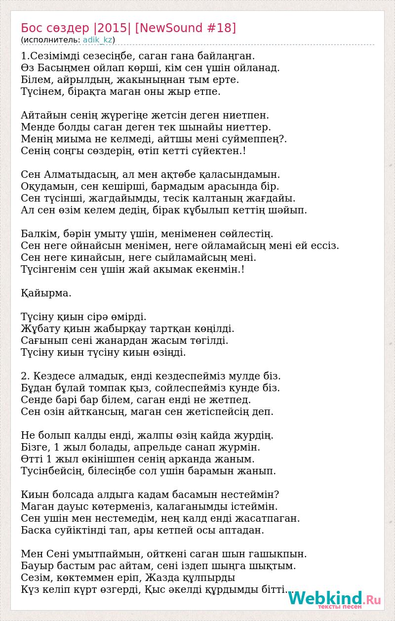 1.Сезімімді сезесіңбе, саган гана байлаңган. Өз Басыңмен ойлап көрші, кім сен үшін ойланад. Білем, айрылдың, жакыныңнан тым ерте. Түсінем, бірақта маган оны жыр етпе. Айтайын сенің жүрегіңе жетсін деген ниетпен. Менде болды саган деген тек шынайы ниеттер. Менің миыма не келмеді, айтшы мені суймеппең?. Сенің соңгы сөздерің, өтіп кетті сүйектен.! Сен Алматыдасың, ал мен ақтөбе қаласындамын. Оқудамын, сен кешірші, бармадым арасында бір. Сен түсінші, жагдайымды, тесік калтаның жағдайы. Ал сен өзім келем дедің, бірак кұбылып кеттің шәйып. Балкім, бәрін умыту үшін, меніменен сөйлестің. Сен неге ойнайсын менімен, неге ойламайсың мені ей ессіз. Сен неге кинайсын, неге сыйламайсың мені. Түсінгенім сен үшін жай акымак екенмін.! Қайырма. Түсіну қиын сірә өмірді. Жұбату қиын жабырқау тартқан көңілді. Сағынып сені жанардан жасым төгілді. Түсіну киын түсіну киын өзіңді. 2. Кездесе алмадык, енді кездеспейміз мулде біз. Бұдан бұлай томпак қыз, сойлеспейміз кунде біз. Сенде барі бар білем, саган енді не жетпед. Сен озін айткансың, маган сен жетіспейсің деп. Не болып калды енді, жалпы өзің кайда журдің. Бізге, 1 жыл болады, апрельде санап журмін. Өтті 1 жыл өкінішпен сенің арканда жаным. Тусінбейсің, білесіңбе сол ушін барамын жанып. Киын болсада алдыга кадам басамын нестеймін? Маган дауыс көтерменіз, калаганымды істеймін. Сен ушін мен нестемедім, нең калд енді жасатпаган. Баска суйіктінді тап, ары кетпей осы аптадан. Мен Сені умытпаймын, ойткені саган шын гашыкпын. Бауыр бастым рас айтам, сені іздеп шыңга шықтым. Сезім, көктеммен еріп, Жазда құлпырды Күз келіп күрт өзгерді, Қыс әкелді құрдымды бітті....