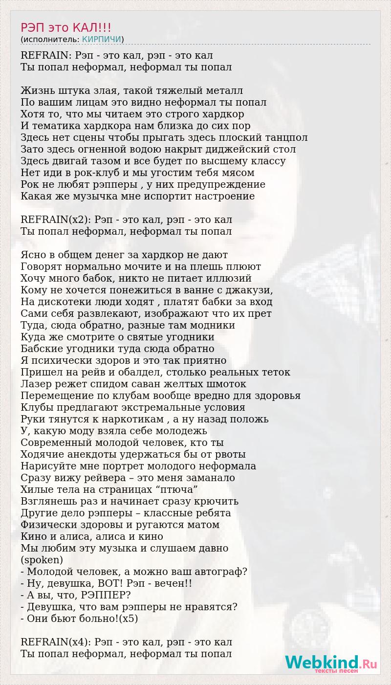 REFRAIN: Рэп - это кал, рэп - это кал Ты попал неформал, неформал ты попал Жизнь штука злая, такой тяжелый металл По вашим лицам это видно неформал ты попал Хотя то, что мы читаем это строго хардкор И тематика хардкора нам близка до сих пор Здесь нет сцены чтобы прыгать здесь плоский танцпол Зато здесь огненной водою накрыт диджейский стол Здесь двигай тазом и все будет по высшему классу Нет иди в рок-клуб и мы угостим тебя мясом Рок не любят рэпперы , у них предупреждение Какая же музычка мне испортит настроение REFRAIN(x2): Рэп - это кал, рэп - это кал Ты попал неформал, неформал ты попал Ясно в общем денег за хардкор не дают Говорят нормально мочите и на плешь плюют Хочу много бабок, никто не питает иллюзий Кому не хочется понежиться в ванне c джакузи, На дискотеки люди ходят , платят бабки за вход Сами себя развлекают, изображают что их прет Туда, сюда обратно, разные там модники Куда же смотрите о святые угодники Бабские угодники туда сюда обратно Я психически здоров и это так приятно Пришел на рейв и обалдел, столько реальных теток Лазер режет спидом саван желтых шмоток Перемещение по клубам вообще вредно для здоровья Клубы предлагают экстремальные условия Руки тянутся к наркотикам , а ну назад положь У, какую моду взяла себе молодежь Современный молодой человек, кто ты Ходячие анекдоты удержаться бы от рвоты Нарисуйте мне портрет молодого неформала Сразу вижу рейвера – это меня заманало Хилые тела на страницах “птюча” Взглянешь раз и начинает сразу крючить Другие дело рэпперы – классные ребята Физически здоровы и ругаются матом Кино и алиса, алиса и кино Мы любим эту музыка и слушаем давно (spoken) - Молодой человек, а можно ваш автограф? - Ну, девушка, ВОТ! Рэп - вечен!! - А вы, что, РЭППЕР? - Девушка, что вам рэпперы не нравятся? - Они бьют больно!(х5) REFRAIN(х4): Рэп - это кал, рэп - это кал Ты попал неформал, неформал ты попал