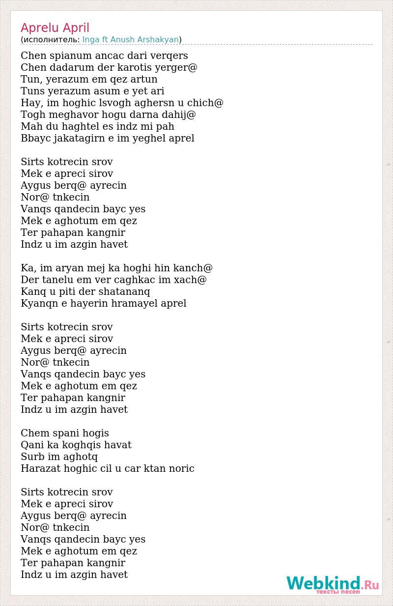 Chen spianum ancac dari verqers Chen dadarum der karotis yerger@ Tun, yerazum em qez artun Tuns yerazum asum e yet ari Hay, im hoghic lsvogh aghersn u chich@ Togh meghavor hogu darna dahij@ Mah du haghtel es indz mi pah Bbayc jakatagirn e im yeghel aprel Sirts kotrecin srov Mek e apreci sirov Aygus berq@ ayrecin Nor@ tnkecin Vanqs qandecin bayc yes Mek e aghotum em qez Ter pahapan kangnir Indz u im azgin havet Ka, im aryan mej ka hoghi hin kanch@ Der tanelu em ver caghkac im xach@ Kanq u piti der shatananq Kyanqn e hayerin hramayel aprel Sirts kotrecin srov Mek e apreci sirov Aygus berq@ ayrecin Nor@ tnkecin Vanqs qandecin bayc yes Mek e aghotum em qez Ter pahapan kangnir Indz u im azgin havet Chem spani hogis Qani ka koghqis havat Surb im aghotq Harazat hoghic cil u car ktan noric Sirts kotrecin srov Mek e apreci sirov Aygus berq@ ayrecin Nor@ tnkecin Vanqs qandecin bayc yes Mek e aghotum em qez Ter pahapan kangnir Indz u im azgin havet