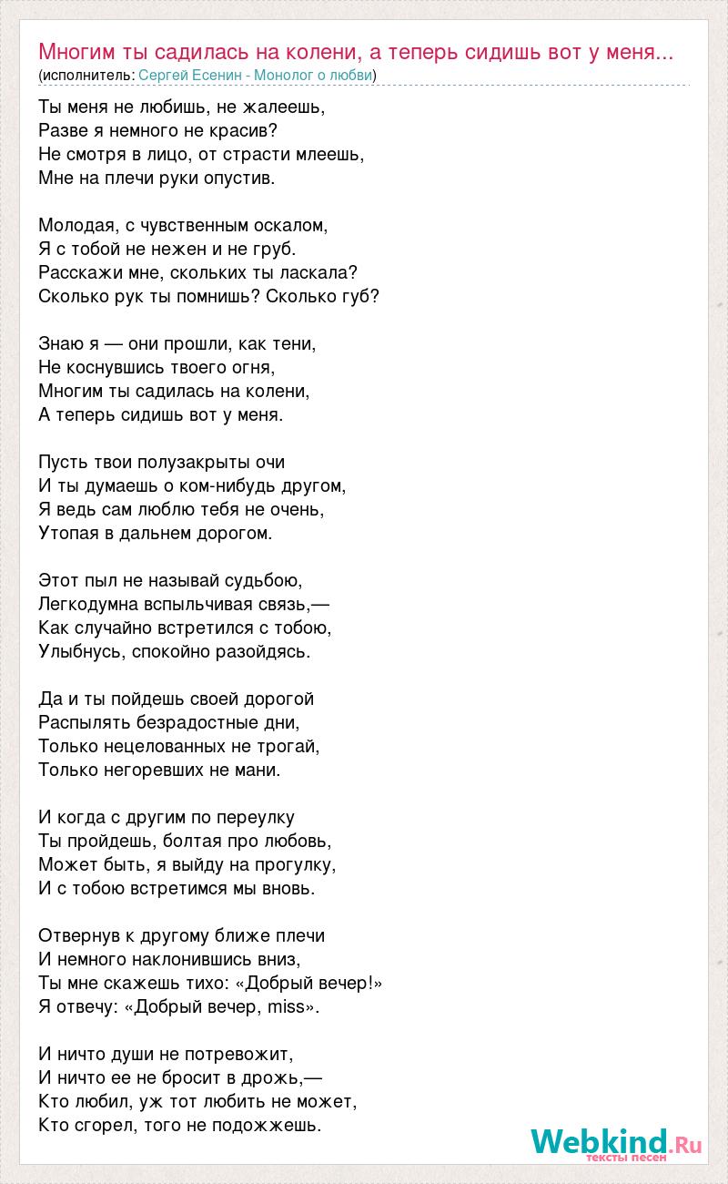 Главная→Исполнители→Сергей Есенин - Монолог о любви→Многим ты садилась на колени, а теперь сидишь вот у меня...