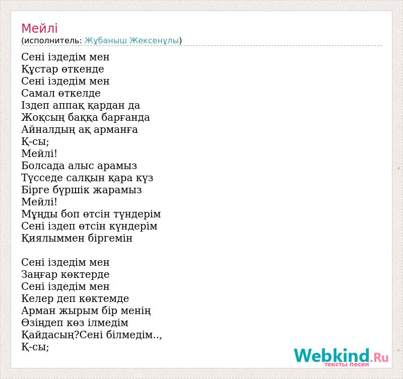 Сені іздедім мен Құстар өткенде Сені іздедім мен Самал өткелде Іздеп аппақ қардан да Жоқсың баққа барғанда Айналдың ақ арманға Қ-сы; Мейлі! Болсада алыс арамыз Түсседе салқын қара күз Бірге бүршік жарамыз Мейлі! Мұңды боп өтсін түндерім Сені іздеп өтсін күндерім Қиялыммен біргемін Сені іздедім мен Заңғар көктерде Сені іздедім мен Келер деп көктемде Арман жырым бір менің Өзіңдеп көз ілмедім Қайдасың?Сені білмедім.., Қ-сы;