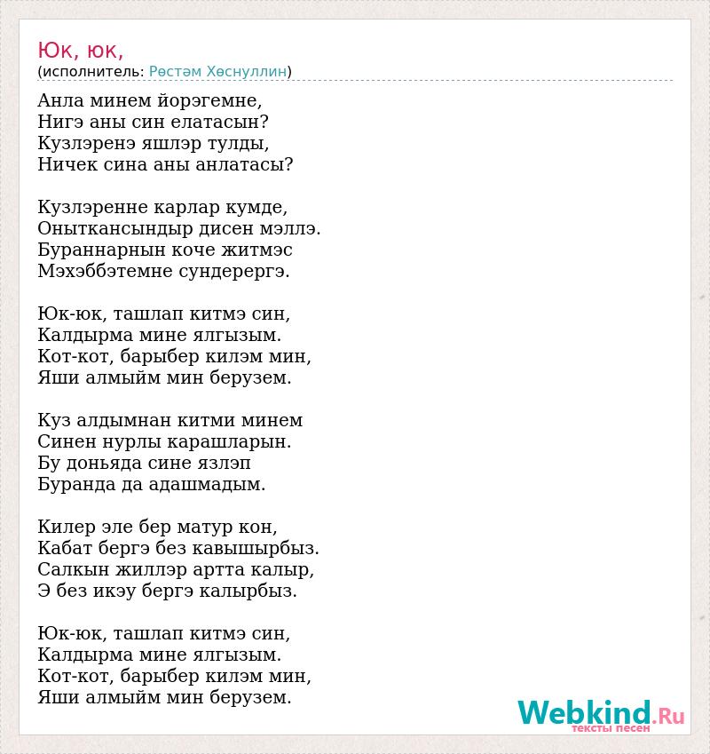 Анла минем йорэгемне, Нигэ аны син елатасын? Кузлэренэ яшлэр тулды, Ничек сина аны анлатасы? Кузлэренне карлар кумде, Оныткансындыр дисен мэллэ. Бураннарнын коче житмэс Мэхэббэтемне сундерергэ. Юк-юк, ташлап китмэ син, Калдырма мине ялгызым. Кот-кот, барыбер килэм мин, Яши алмыйм мин берузем. Куз алдымнан китми минем Синен нурлы карашларын. Бу доньяда сине язлэп Буранда да адашмадым. Килер эле бер матур кон, Кабат бергэ без кавышырбыз. Салкын жиллэр артта калыр, Э без икэу бергэ калырбыз. Юк-юк, ташлап китмэ син, Калдырма мине ялгызым. Кот-кот, барыбер килэм мин, Яши алмыйм мин берузем.