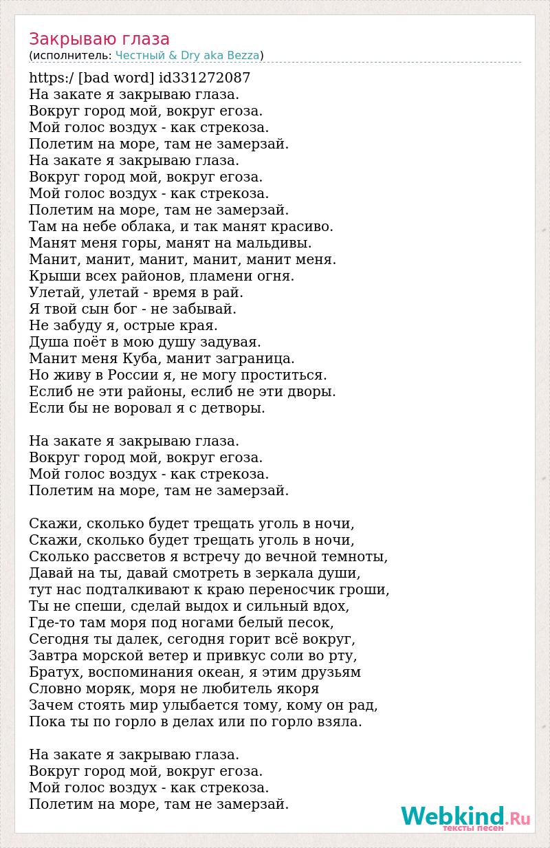 https:/ [bad word] id331272087 На закате я закрываю глаза. Вокруг город мой, вокруг егоза. Мой голос воздух - как стрекоза. Полетим на море, там не замерзай. На закате я закрываю глаза. Вокруг город мой, вокруг егоза. Мой голос воздух - как стрекоза. Полетим на море, там не замерзай. Там на небе облака, и так манят красиво. Манят меня горы, манят на мальдивы. Манит, манит, манит, манит, манит меня. Крыши всех районов, пламени огня. Улетай, улетай - время в рай. Я твой сын бог - не забывай. Не забуду я, острые края. Душа поёт в мою душу задувая. Манит меня Куба, манит заграница. Но живу в России я, не могу проститься. Еслиб не эти районы, еслиб не эти дворы. Если бы не воровал я с детворы. На закате я закрываю глаза. Вокруг город мой, вокруг егоза. Мой голос воздух - как стрекоза. Полетим на море, там не замерзай. Скажи, сколько будет трещать уголь в ночи, Скажи, сколько будет трещать уголь в ночи, Сколько рассветов я встречу до вечной темноты, Давай на ты, давай смотреть в зеркала души, тут нас подталкивают к краю переносчик гроши, Ты не спеши, сделай выдох и сильный вдох, Где-то там моря под ногами белый песок, Сегодня ты далек, сегодня горит всё вокруг, Завтра морской ветер и привкус соли во рту, Братух, воспоминания океан, я этим друзьям Словно моряк, моря не любитель якоря Зачем стоять мир улыбается тому, кому он рад, Пока ты по горло в делах или по горло взяла. На закате я закрываю глаза. Вокруг город мой, вокруг егоза. Мой голос воздух - как стрекоза. Полетим на море, там не замерзай.