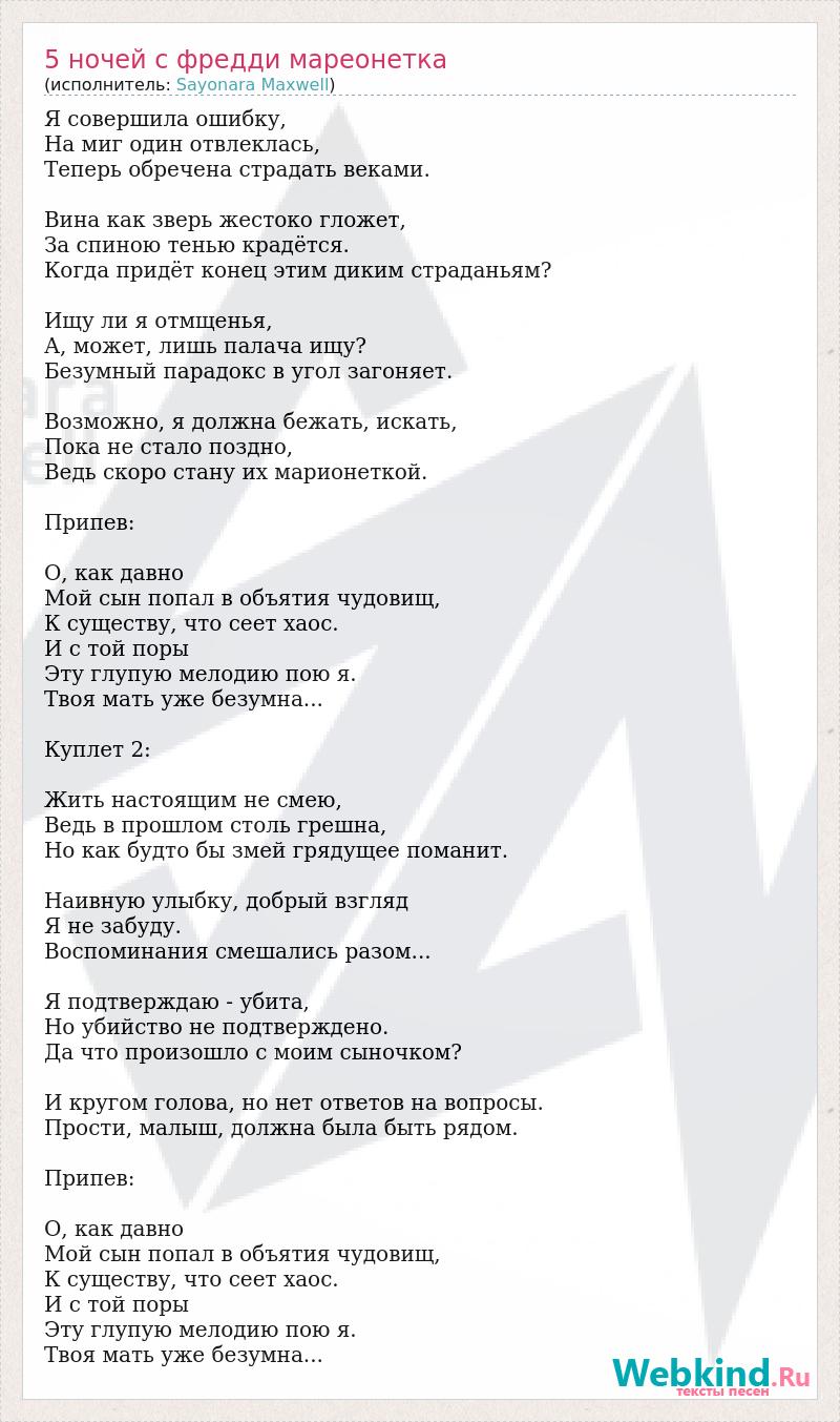 А как ты думаешь, о чем песня "5 ночей с фредди мареонетка" ?