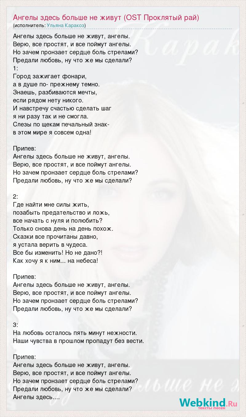 Ангелы здесь больше не живут, ангелы. Верю, все простят, и все поймут ангелы. Но зачем пронзает сердце боль стрелами? Предали любовь, ну что же мы сделали? 1: Город зажигает фонари, а в душе по- прежнему темно. Знаешь, разбиваются мечты, если рядом нету никого. И навстречу счастью сделать шаг я ни разу так и не смогла. Слезы по щекам печальный знак- в этом мире я совсем одна! Припев: Ангелы здесь больше не живут, ангелы. Верю, все простят, и все поймут ангелы. Но зачем пронзает сердце боль стрелами? Предали любовь, ну что же мы сделали? 2: Где найти мне силы жить, позабыть предательство и ложь, все начать с нуля и полюбить? Только снова день на день похож. Сказки все прочитаны давно, я устала верить в чудеса. Все бы изменить! Но не дано?! Как хочу я к ним... на небеса! Припев: Ангелы здесь больше не живут, ангелы. Верю, все простят, и все поймут ангелы. Но зачем пронзает сердце боль стрелами? Предали любовь, ну что же мы сделали? 3: На любовь осталось пять минут нежности. Наши чувства в прошлом пропадут без вести. Припев: Ангелы здесь больше не живут, ангелы. Верю, все простят, и все поймут ангелы. Но зачем пронзает сердце боль стрелами? Предали любовь, ну что же мы сделали? Ангелы здесь....