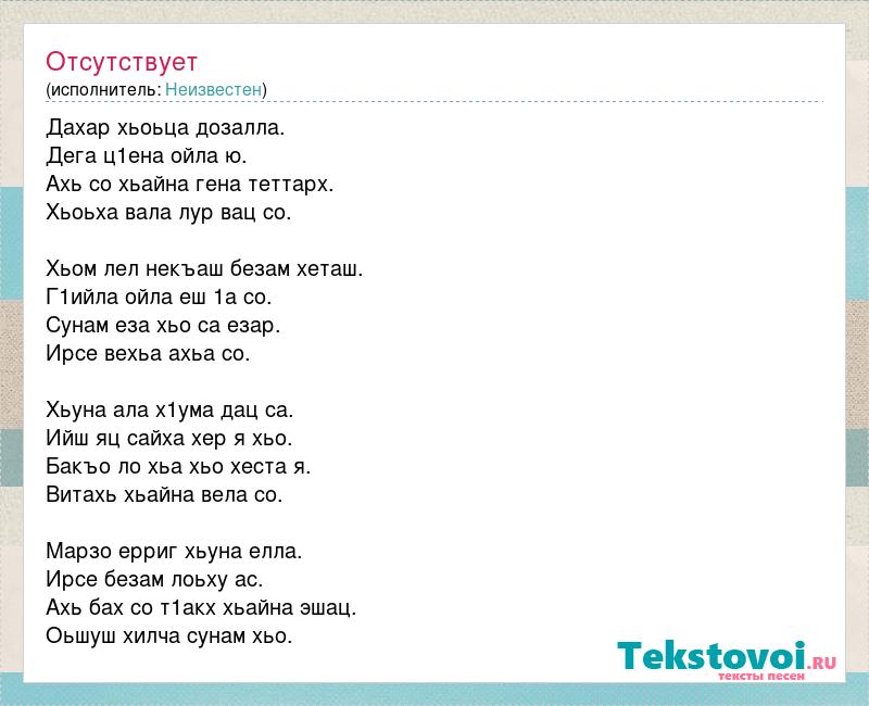 Дахар хьоьца дозалла. Дега ц1ена ойла ю. Ахь со хьайна гена теттарх. Хьоьха вала лур вац со. Хьом лел некъаш безам хеташ. Г1ийла ойла еш 1а со. Сунам еза хьо са езар. Ирсе вехьа ахьа со. Хьуна ала х1ума дац са. Ийш яц сайха хер я хьо. Бакъо ло хьа хьо хеста я. Витахь хьайна вела со. Марзо ерриг хьуна елла. Ирсе безам лоьху ас. Ахь бах со т1акх хьайна эшац. Оьшуш хилча сунам хьо.
