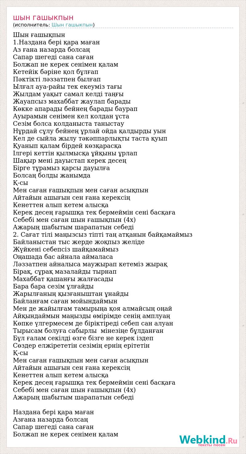 Шын ғашықпын 1.Наздана бері қара маған Аз ғана назарда болсаң Сапар шегеді сана саған Болжап не керек сенімен қалам Кетейік бәріне қол бұлғап Пәктікті ләззатпен былғап Ылғал ауа-райы тек екеуміз тағы Жылдам уақыт самал келді таңғы Жауапсыз махаббат жаулап барады Көкке апарады бейнең барады баурап Ауырамын сенімен кел колдан ұста Сезім болса колданыста таныстау Нұрдай сұлу бейнең ұрлай ойда қалдырды уын Кел де сыйла жылу тәкәппарлықты таста қуып Қуанып қалам бірдей көзқарасқа Ілгері кеттін қылмысқа ұйқыны ұрлап Шақыр мені дауыстап керек десең Бірге тұрамыз қарсы дауылға Болсаң болды жанымда Қ-сы Мен саған ғашықпын мен саған асықпын Айтайын ашығын сен ғана керексің Кенеттен алып кетем алысқа Керек десең ғарышқа тек бермеймін сені басқаға Себебі мен саған шын ғашықпын (4x) Ажарың шабытым шарапатын себеді 2. Сағат тілі маңызсыз тіпті таң атқанын байқамаймыз Байланыстан тыс жерде жоқпыз желіде Жүйкені себепсіз шайқамаймыз Оңашада бас айнала аймаласа Ләззатпен айналыса маужырап кетеміз жырақ Бірақ, сұрақ мазалайды тырнап Махаббат қашанғы жалғасады Бара бара сезім ұлғайды Жарылғаның қызғаныштан ұнайды Байланғам саған мойындаймын Мен де жайылғам тамырыңа қоя алмайсың оңай Айқындаймын маңызды өмірімде сенің амплуаң Көпке үлгермесем де біріктіреді себеп сан алуан Тырысам болуға сабырлы мінезіңе бұлданған Бұл ғалам секілді өзге бізге не керек іздеп Сөздер елжірететін сезімің ернің ерітетін Қ-сы Мен саған ғашықпын мен саған асықпын Айтайын ашығын сен ғана керексің Кенеттен алып кетем алысқа Керек десең ғарышқа тек бермеймін сені басқаға Себебі мен саған шын ғашықпын (4x) Ажарың шабытым шарапатын себеді Наздана бері қара маған Азғана назарда болсаң Сапар шегеді сана саған Болжап не керек сенімен қалам