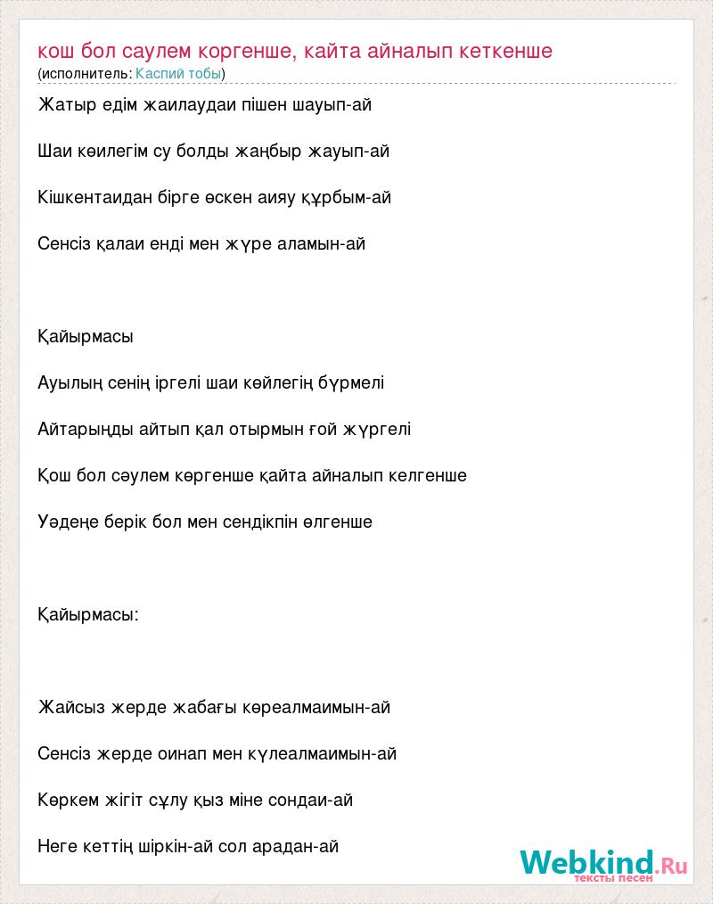 Жатыр едім жаилаудаи пішен шауып-ай Шаи көилегім су болды жаңбыр жауып-ай Кішкентаидан бірге өскен аияу құрбым-ай Сенсіз қалаи енді мен жүре аламын-ай Қайырмасы Ауылың сенің іргелі шаи көйлегің бүрмелі Айтарыңды айтып қал отырмын ғой жүргелі Қош бол сәулем көргенше қайта айналып келгенше Уәдеңе берік бол мен сендікпін өлгенше Қайырмасы: Жайсыз жерде жабағы көреалмаимын-ай Сенсіз жерде оинап мен күлеалмаимын-ай Көркем жігіт сұлу қыз міне сондаи-ай Неге кеттің шіркін-ай сол арадан-ай