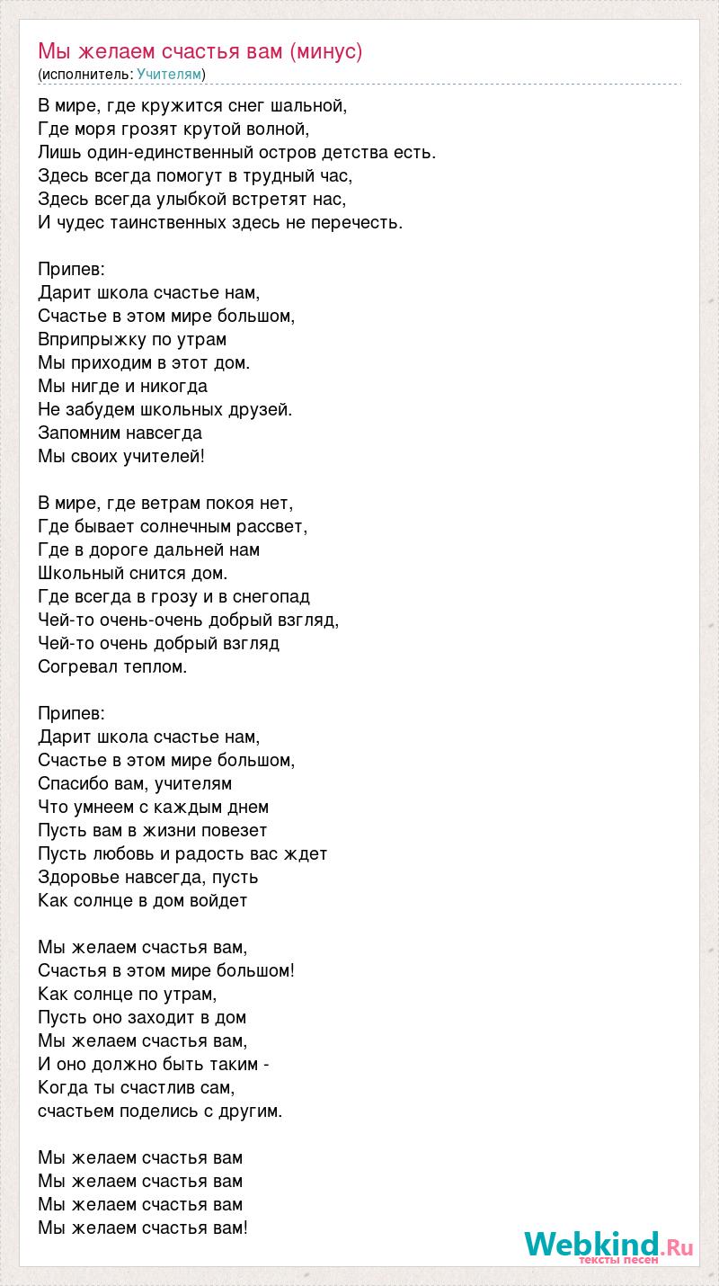 В мире, где кружится снег шальной, Где моря грозят крутой волной, Лишь один-единственный остров детства есть. Здесь всегда помогут в трудный час, Здесь всегда улыбкой встретят нас, И чудес таинственных здесь не перечесть. Припев: Дарит школа счастье нам, Счастье в этом мире большом, Вприпрыжку по утрам Мы приходим в этот дом. Мы нигде и никогда Не забудем школьных друзей. Запомним навсегда Мы своих учителей! В мире, где ветрам покоя нет, Где бывает солнечным рассвет, Где в дороге дальней нам Школьный снится дом. Где всегда в грозу и в снегопад Чей-то очень-очень добрый взгляд, Чей-то очень добрый взгляд Согревал теплом. Припев: Дарит школа счастье нам, Счастье в этом мире большом, Спасибо вам, учителям Что умнеем с каждым днем Пусть вам в жизни повезет Пусть любовь и радость вас ждет Здоровье навсегда, пусть Как солнце в дом войдет Мы желаем счастья вам, Счастья в этом миpе большом! Как солнце по yтpам, Пyсть оно заходит в дом Мы желаем счастья вам, И оно должно быть таким - Когда ты счастлив сам, счастьем поделись с другим. Мы желаем счастья вам Мы желаем счастья вам Мы желаем счастья вам Мы желаем счастья вам!