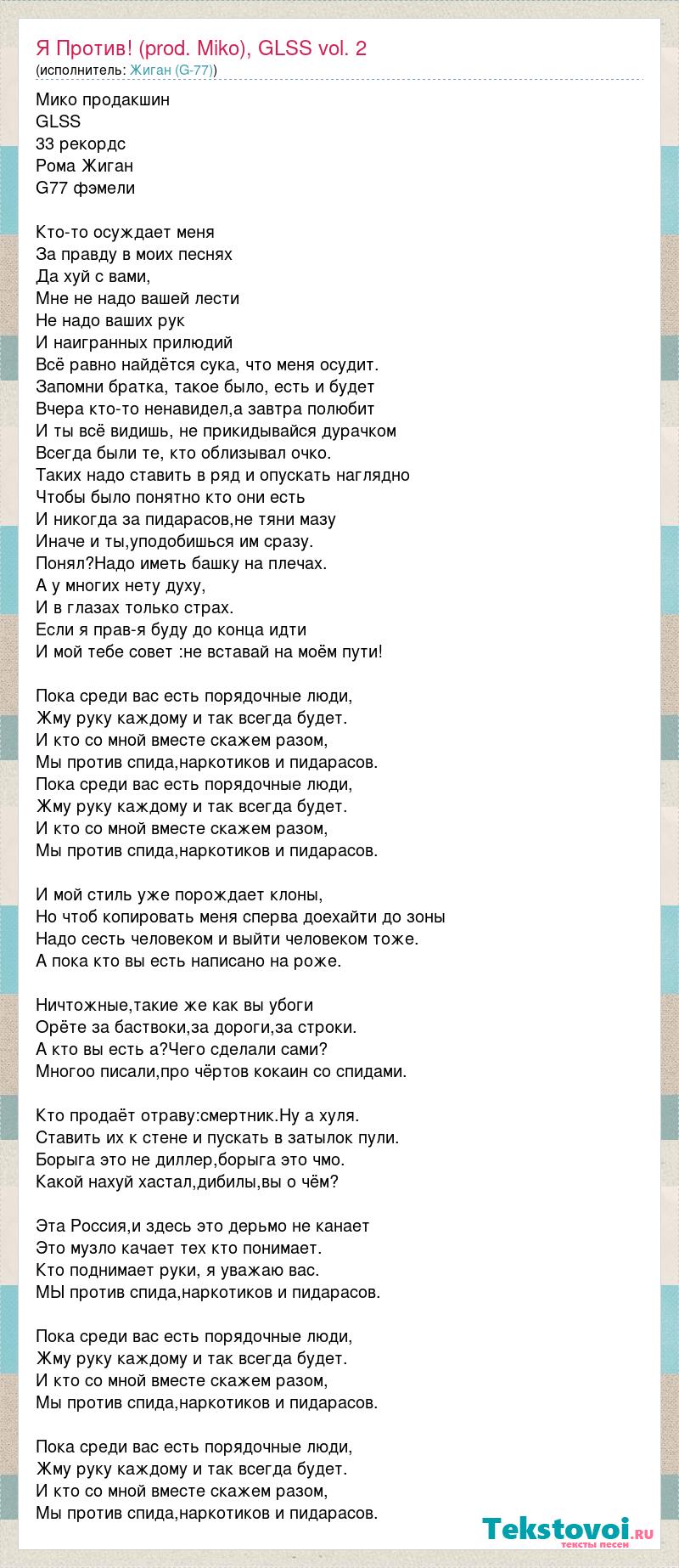 Мико продакшин GLSS 33 рекордс Рома Жиган G77 фэмели Кто-то осуждает меня За правду в моих песнях Да хуй с вами, Мне не надо вашей лести Не надо ваших рук И наигранных прилюдий Всё равно найдётся сука, что меня осудит. Запомни братка, такое было, есть и будет Вчера кто-то ненавидел,а завтра полюбит И ты всё видишь, не прикидывайся дурачком Всегда были те, кто облизывал очко. Таких надо ставить в ряд и опускать наглядно Чтобы было понятно кто они есть И никогда за пидарасов,не тяни мазу Иначе и ты,уподобишься им сразу. Понял?Надо иметь башку на плечах. А у многих нету духу, И в глазах только страх. Если я прав-я буду до конца идти И мой тебе совет :не вставай на моём пути! Пока среди вас есть порядочные люди, Жму руку каждому и так всегда будет. И кто со мной вместе скажем разом, Мы против спида,наркотиков и пидарасов. Пока среди вас есть порядочные люди, Жму руку каждому и так всегда будет. И кто со мной вместе скажем разом, Мы против спида,наркотиков и пидарасов. И мой стиль уже порождает клоны, Но чтоб копировать меня сперва доехайти до зоны Надо сесть человеком и выйти человеком тоже. А пока кто вы есть написано на роже. Ничтожные,такие же как вы убоги Орёте за баствоки,за дороги,за строки. А кто вы есть а?Чего сделали сами? Многоо писали,про чёртов кокаин со спидами. Кто продаёт отраву:смертник.Ну а хуля. Ставить их к стене и пускать в затылок пули. Борыга это не диллер,борыга это чмо. Какой нахуй хастал,дибилы,вы о чём? Эта Россия,и здесь это дерьмо не канает Это музло качает тех кто понимает. Кто поднимает руки, я уважаю вас. МЫ против спида,наркотиков и пидарасов. Пока среди вас есть порядочные люди, Жму руку каждому и так всегда будет. И кто со мной вместе скажем разом, Мы против спида,наркотиков и пидарасов. Пока среди вас есть порядочные люди, Жму руку каждому и так всегда будет. И кто со мной вместе скажем разом, Мы против спида,наркотиков и пидарасов.