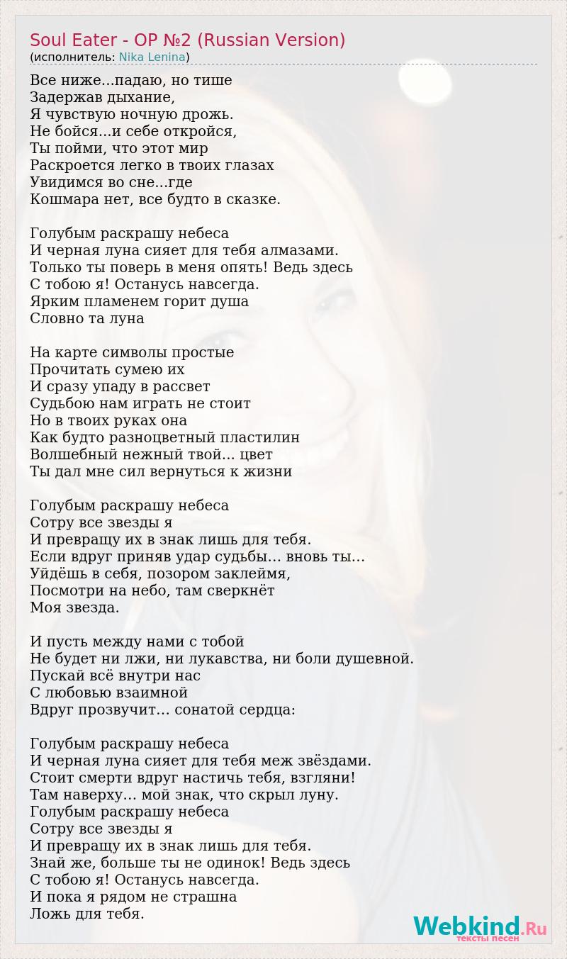 Все ниже...падаю, но тише Задержав дыхание, Я чувствую ночную дрожь. Не бойся...и себе откройся, Ты пойми, что этот мир Раскроется легко в твоих глазах Увидимся во сне...где Кошмара нет, все будто в сказке. Голубым раскрашу небеса И черная луна сияет для тебя алмазами. Только ты поверь в меня опять! Ведь здесь С тобою я! Останусь навсегда. Ярким пламенем горит душа Словно та луна На карте символы простые Прочитать сумею их И сразу упаду в рассвет Судьбою нам играть не стоит Но в твоих руках она Как будто разноцветный пластилин Волшебный нежный твой... цвет Ты дал мне сил вернуться к жизни Голубым раскрашу небеса Сотру все звезды я И превращу их в знак лишь для тебя. Если вдруг приняв удар судьбы… вновь ты… Уйдёшь в себя, позором заклеймя, Посмотри на небо, там сверкнёт Моя звезда. И пусть между нами с тобой Не будет ни лжи, ни лукавства, ни боли душевной. Пускай всё внутри нас С любовью взаимной Вдруг прозвучит… сонатой сердца: Голубым раскрашу небеса И черная луна сияет для тебя меж звёздами. Стоит смерти вдруг настичь тебя, взгляни! Там наверху… мой знак, что скрыл луну. Голубым раскрашу небеса Сотру все звезды я И превращу их в знак лишь для тебя. Знай же, больше ты не одинок! Ведь здесь С тобою я! Останусь навсегда. И пока я рядом не страшна Ложь для тебя.