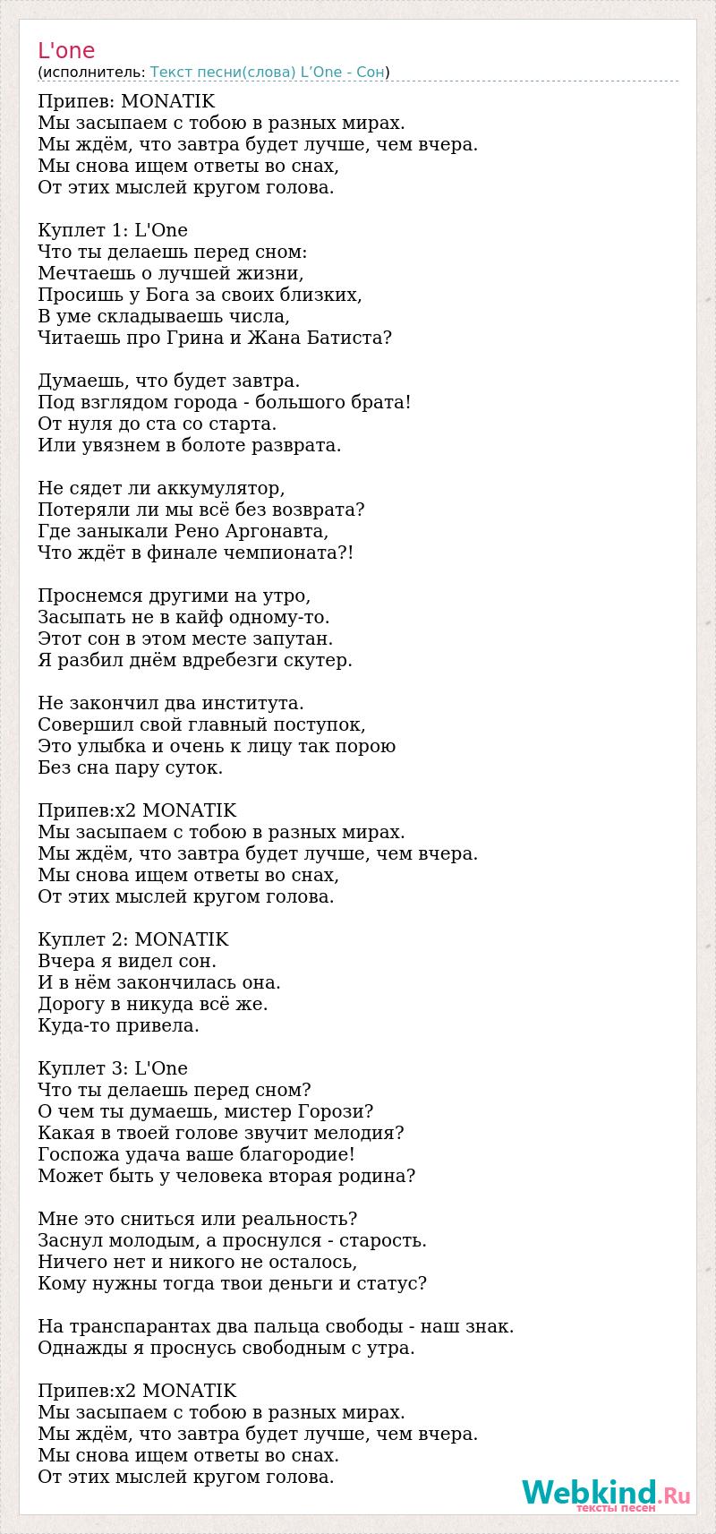 Припев: MONATIK Мы засыпаем с тобою в разных мирах. Мы ждём, что завтра будет лучше, чем вчера. Мы снова ищем ответы во снах, От этих мыслей кругом голова. Куплет 1: L'One Что ты делаешь перед сном: Мечтаешь о лучшей жизни, Просишь у Бога за своих близких, В уме складываешь числа, Читаешь про Грина и Жана Батиста? Думаешь, что будет завтра. Под взглядом города - большого брата! От нуля до ста со старта. Или увязнем в болоте разврата. Не сядет ли аккумулятор, Потеряли ли мы всё без возврата? Где заныкали Рено Аргонавта, Что ждёт в финале чемпионата?! Проснемся другими на утро, Засыпать не в кайф одному-то. Этот сон в этом месте запутан. Я разбил днём вдребезги скутер. Не закончил два института. Совершил свой главный поступок, Это улыбка и очень к лицу так порою Без сна пару суток. Припев:х2 MONATIK Мы засыпаем с тобою в разных мирах. Мы ждём, что завтра будет лучше, чем вчера. Мы снова ищем ответы во снах, От этих мыслей кругом голова. Куплет 2: MONATIK Вчера я видел сон. И в нём закончилась она. Дорогу в никуда всё же. Куда-то привела. Куплет 3: L'One Что ты делаешь перед сном? О чем ты думаешь, мистер Горози? Какая в твоей голове звучит мелодия? Госпожа удача ваше благородие! Может быть у человека вторая родина? Мне это сниться или реальность? Заснул молодым, а проснулся - старость. Ничего нет и никого не осталось, Кому нужны тогда твои деньги и статус? На транспарантах два пальца свободы - наш знак. Однажды я проснусь свободным с утра. Припев:х2 MONATIK Мы засыпаем с тобою в разных мирах. Мы ждём, что завтра будет лучше, чем вчера. Мы снова ищем ответы во снах. От этих мыслей кругом голова.