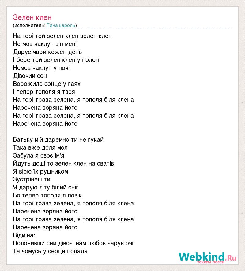 На горі той зелен клен зелен клен Не мов чаклун він мені Дарує чари кожен день І бере той зелен клен у полон Немов чаклун у ночі Дівочий сон Ворожило сонце у гаях І тепер тополя я твоя На горі трава зелена, я тополя біля клена Наречена зоряна його На горі трава зелена, я тополя біля клена Наречена зоряна його Батьку мій даремно ти не гукай Така вже доля моя Забула я своє ім'я Йдуть дощі то зелен клен на сватів Я вірю їх рушником Зустрінеш ти Я дарую літу білий сніг Бо тепер тополя я повік На горі трава зелена, я тополя біля клена Наречена зоряна його На горі трава зелена, я тополя біля клена Наречена зоряна його Відміна: Полонивши сни дівочі нам любов чарує очі Та чомусь у серце попада