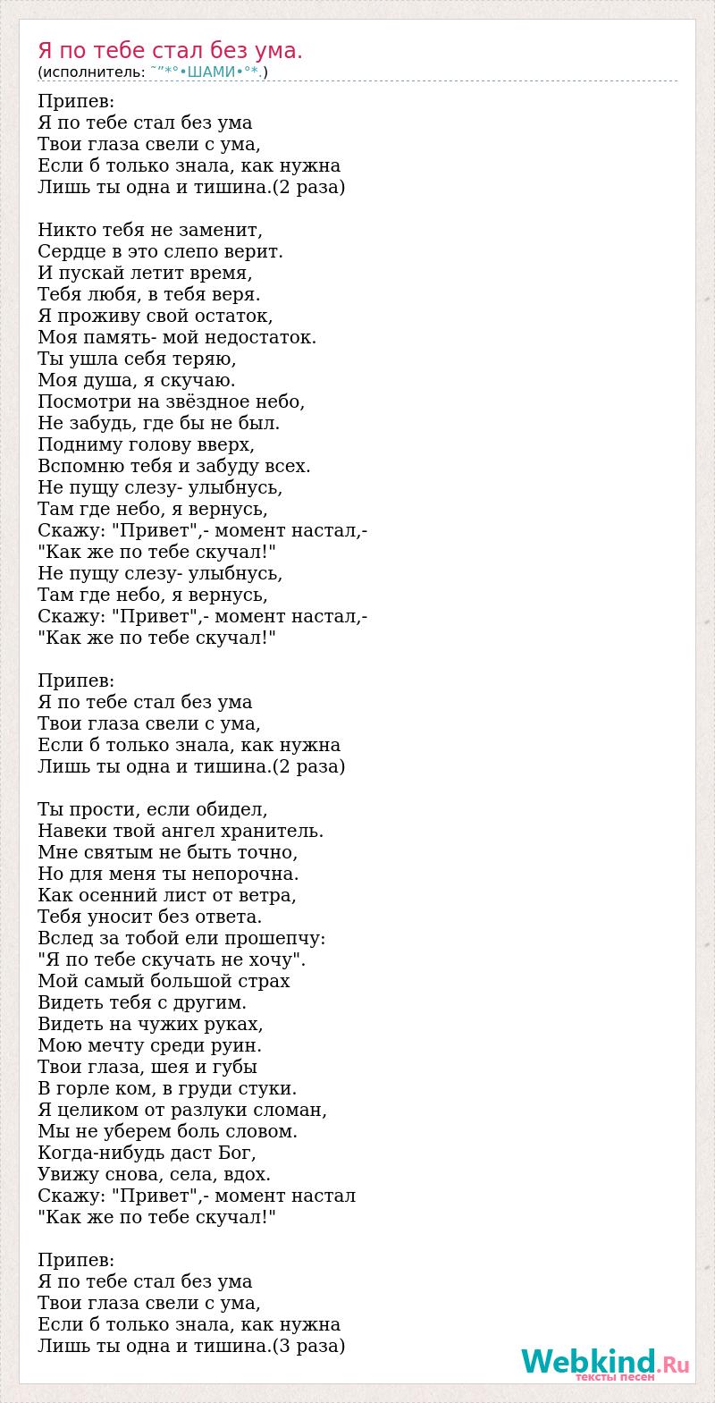 Припев: Я по тебе стал без ума Твои глаза свели с ума, Если б только знала, как нужна Лишь ты одна и тишина.(2 раза) Никто тебя не заменит, Сердце в это слепо верит. И пускай летит время, Тебя любя, в тебя веря. Я проживу свой остаток, Моя память- мой недостаток. Ты ушла себя теряю, Моя душа, я скучаю. Посмотри на звёздное небо, Не забудь, где бы не был. Подниму голову вверх, Вспомню тебя и забуду всех. Не пущу слезу- улыбнусь, Там где небо, я вернусь, Скажу: "Привет",- момент настал,- "Как же по тебе скучал!" Не пущу слезу- улыбнусь, Там где небо, я вернусь, Скажу: "Привет",- момент настал,- "Как же по тебе скучал!" Припев: Я по тебе стал без ума Твои глаза свели с ума, Если б только знала, как нужна Лишь ты одна и тишина.(2 раза) Ты прости, если обидел, Навеки твой ангел хранитель. Мне святым не быть точно, Но для меня ты непорочна. Как осенний лист от ветра, Тебя уносит без ответа. Вслед за тобой ели прошепчу: "Я по тебе скучать не хочу". Мой самый большой страх Видеть тебя с другим. Видеть на чужих руках, Мою мечту среди руин. Твои глаза, шея и губы В горле ком, в груди стуки. Я целиком от разлуки сломан, Мы не уберем боль словом. Когда-нибудь даст Бог, Увижу снова, села, вдох. Скажу: "Привет",- момент настал "Как же по тебе скучал!" Припев: Я по тебе стал без ума Твои глаза свели с ума, Если б только знала, как нужна Лишь ты одна и тишина.(3 раза)