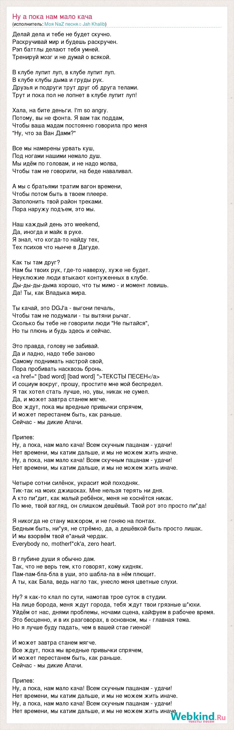Делай дела и тебе не будет скучно. Раскручивай мир и будешь раскручен. Рэп баттлы делают тебя умней. Тренируй мозг и не думай о всякой. В клубе лупит луп, в клубе лупит луп. В клубе клубы дыма и груды рук. Друзья и подруги трут друг об друга телами. Трут и пока пол не лопнет в клубе лупит луп! Хала, на бите деньги. I'm so angry. Потому, вы не фонта. Я вам так поддам, Чтобы ваша мадам постоянно говорила про меня "Ну, что за Ван Дамм?" Все мы намерены урвать куш, Под ногами нашими немало душ. Мы идём по головам, и не надо молва, Чтобы там не говорили, на беде наваливал. А мы с братьями тратим вагон времени, Чтобы потом быть в твоем плеере. Заполонить твой район треками. Пора наружу подъем, это мы. Наш каждый день это weekend, Да, иногда и майк в руке. Я знал, что когда-то найду тех, Тех психов что нынче в Дагуде. Как ты там друг? Нам бы твоих рук, где-то наверху, хуже не будет. Неуклюжие люди втыкают контуженных в клубе. Ды-ды-ды-дыма хорошо, что ты мимо - и момент ловишь. Да! Ты, как Владыка мира. Ты качай, это DGJ'а - выгони печаль, Чтобы там не подумали - ты вытяни рычаг. Сколько бы тебе не говорили люди "Не пытайся", Но ты плюнь и будь здесь и сейчас. Это правда, голову не забивай. Да и ладно, надо тебе заново Самому поднимать настрой свой, Пора пробивать насквозь бронь. <a href=" [bad word] [bad word] ">ТЕКСТЫ ПЕСЕН</a> И социум вокруг, прошу, простите мне мой беспредел. Я так хотел стать лучше, но, увы, никак не сумел. Да, и может завтра станем мягче. Все ждут, пока мы вредные привычки спрячем, И может перестанем быть, как раньше. Сейчас - мы дикие Апачи. Припев: Ну, а пока, нам мало кача! Всем скучным пацанам - удачи! Нет времени, мы катим дальше, и мы не можем жить иначе. Ну, а пока, нам мало кача! Всем скучным пацанам - удачи! Нет времени, мы катим дальше, и мы не можем жить иначе. Четыре сотни силёнок, украсит мой походняк. Тик-так на моих джишоках. Мне нельзя терять ни дня. А кто пи*дит, как малый ребёнок, меня не коснётся никак. По мне, твой взгляд, он слишком дешёвый. Твой рот это просто пи*да! Я никогда не стану мажором, и не гоняю на понтах. Бедным быть, ни*уя, не стрёмно, да, а дешёвкой быть просто лишак. И мы взорвём твой е*аный чердак. Everybody no, motherf*ck'a, zero heart. В глубине души я обычно дам. Так, что не верь тем, кто говорят, кому кидняк. Пам-пам-бла-бла в уши, это шабла-ла в нём плющит. А ты, как Бала, ведь нагло так, унесло меня цветные слухи. Ну? я как-то клал по сути, намотав трое суток в студии. На лице борода, меня ждут города, тебя ждут твои грязные ш*юхи. Уйдём от нас, днями проблемы, ночами сцена, кайфуем в рабочее время. Это бесценно, и в их разговорах, в основном, мы - главная тема. Но я лучше буду падать, чем в вашей стае гиеной! И может завтра станем мягче. Все ждут, пока мы вредные привычки спрячем, И может перестанем быть, как раньше. Сейчас - мы дикие Апачи. Припев: Ну, а пока, нам мало кача! Всем скучным пацанам - удачи! Нет времени, мы катим дальше, и мы не можем жить иначе. Ну, а пока, нам мало кача! Всем скучным пацанам - удачи! Нет времени, мы катим дальше, и мы не можем жить иначе.