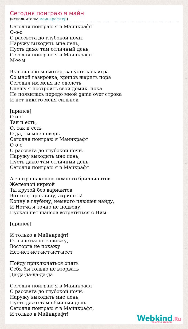 Сегодня поиграю я в Майнкрафт О-о-о С рассвета до глубокой ночи. Наружу выходить мне лень, Пусть даже там отличный день, Сегодня поиграю я в Майнкрафт М-м-м Включаю компьютер, запустилась игра Со мной газировка, крипов жарить пора Сегодня им меня не одолеть~ Спешу я построить свой домик, пока Не появилась передо мной game over строка И нет никого меня сильней [припев] О-о-о Так и есть, О, так и есть О да, ты мне поверь Сегодня поиграю я Майнкрафт О-о-о С рассвета до глубокой ночи. Наружу выходить мне лень, Пусть даже там отличный день, Сегодня поиграю я в Майкрафт А завтра накопаю немного бриллиантов Железной киркой Ты крутой без вариантов Вот это, прокричу, ахринеть! Копну в глубину, немного плюшек найду, И Нотча я точно не подведу, Пускай нет шансов встретиться с Ним. [припев] И только в Майнкрафт! От счастья не завизжу, Восторга не покажу Нет-нет-нет-нет-нет-неет Пойду приключаться опять Себя бы только не взорвать Да-да-да-да-да-да Сегодня поиграю я в Майнкрафт С рассвета до глубокой ночи. Наружу выходить мне лень, Пусть даже там обычный день Сегодня поиграю я в Майнкрафт, И только в Майнкрафт!