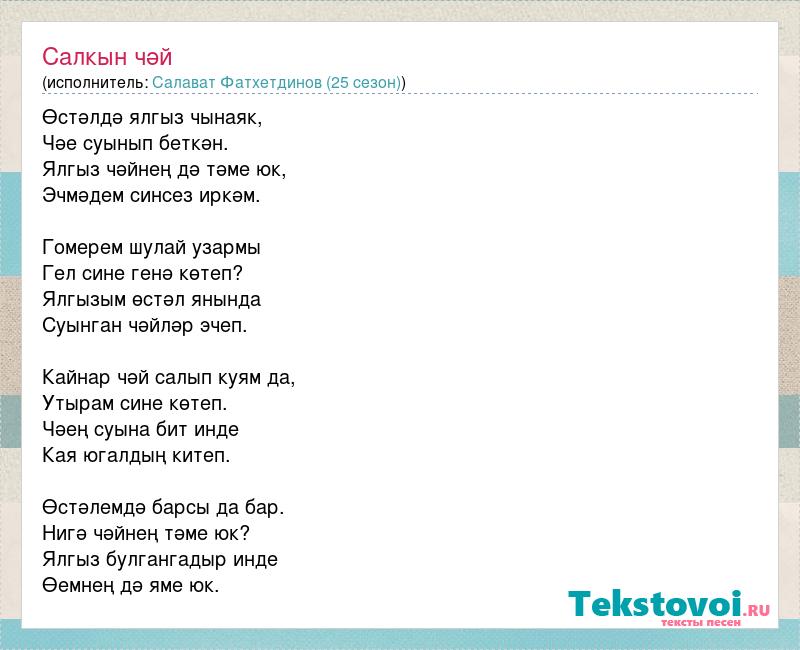 Өстәлдә ялгыз чынаяк, Чәе суынып беткән. Ялгыз чәйнең дә тәме юк, Эчмәдем синсез иркәм. Гомерем шулай узармы Гел сине генә көтеп? Ялгызым өстәл янында Суынган чәйләр эчеп. Кайнар чәй салып куям да, Утырам сине көтеп. Чәең суына бит инде Кая югалдың китеп. Өстәлемдә барсы да бар. Нигә чәйнең тәме юк? Ялгыз булгангадыр инде Өемнең дә яме юк.
