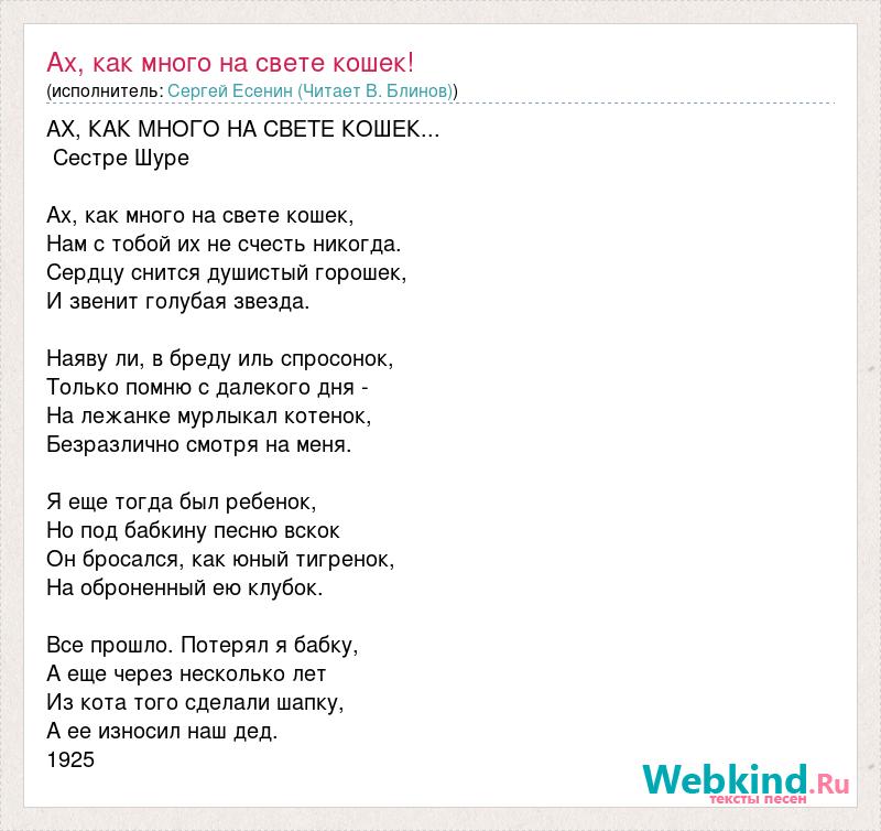 АХ, КАК МНОГО НА СВЕТЕ КОШЕК... Сестре Шуре Ах, как много на свете кошек, Нам с тобой их не счесть никогда. Сердцу снится душистый горошек, И звенит голубая звезда. Наяву ли, в бреду иль спросонок, Только помню с далекого дня - На лежанке мурлыкал котенок, Безразлично смотря на меня. Я еще тогда был ребенок, Но под бабкину песню вскок Он бросался, как юный тигренок, На оброненный ею клубок. Все прошло. Потерял я бабку, А еще через несколько лет Из кота того сделали шапку, А ее износил наш дед. 1925