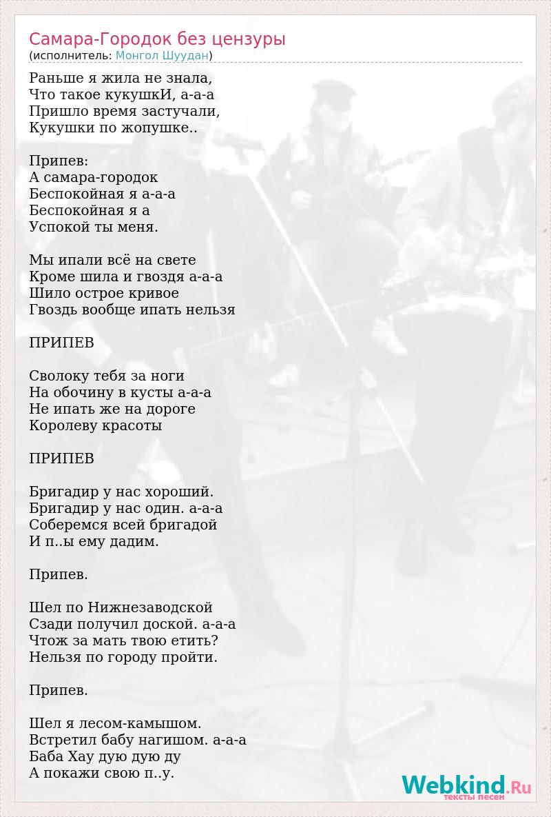 Раньше я жила не знала, Что такое кукушкИ, а-а-а Пришло время застучали, Кукушки по жопушке.. Припев: А самара-городок Беспокойная я а-а-а Беспокойная я а Успокой ты меня. Мы ипали всё на свете Кроме шила и гвоздя а-а-а Шило острое кривое Гвоздь вообще ипать нельзя ПРИПЕВ Сволоку тебя за ноги На обочину в кусты а-а-а Не ипать же на дороге Королеву красоты ПРИПЕВ Бригадир у нас хороший. Бригадир у нас один. а-а-а Соберемся всей бригадой И п..ы ему дадим. Припев. Шел по Нижнезаводской Сзади получил доской. а-а-а Чтож за мать твою етить? Нельзя по городу пройти. Припев. Шел я лесом-камышом. Встретил бабу нагишом. а-а-а Баба Хау дую дую ду А покажи свою п..у.