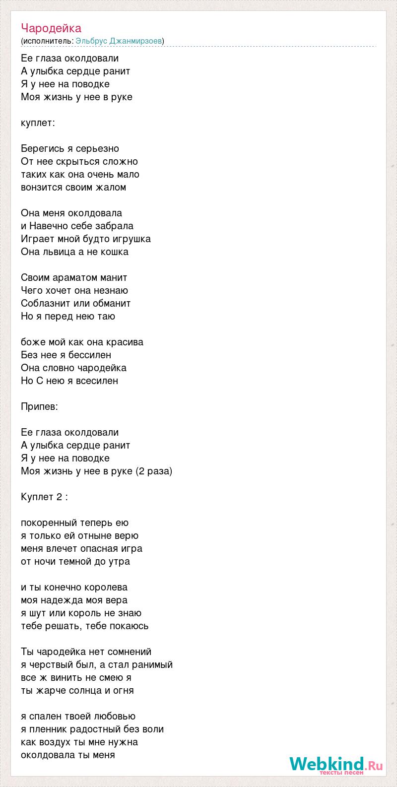 Ее глаза околдовали А улыбка сердце ранит Я у нее на поводке Моя жизнь у нее в руке куплет: Берегись я серьезно От нее скрыться сложно таких как она очень мало вонзится своим жалом Она меня околдовала и Навечно себе забрала Играет мной будто игрушка Она львица а не кошка Своим араматом манит Чего хочет она незнаю Соблазнит или обманит Но я перед нею таю боже мой как она красива Без нее я бессилен Она словно чародейка Но С нею я всесилен Припев: Ее глаза околдовали А улыбка сердце ранит Я у нее на поводке Моя жизнь у нее в руке (2 раза) Куплет 2 : покоренный теперь ею я только ей отныне верю меня влечет опасная игра от ночи темной до утра и ты конечно королева моя надежда моя вера я шут или король не знаю тебе решать, тебе покаюсь Ты чародейка нет сомнений я черствый был, а стал ранимый все ж винить не смею я ты жарче солнца и огня я спален твоей любовью я пленник радостный без воли как воздух ты мне нужна околдовала ты меня