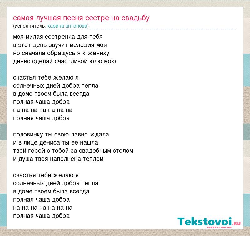 моя милая сестренка для тебя в этот день звучит мелодия моя но сначала обращусь я к жениху денис сделай счастливой юлю мою счастья тебе желаю я солнечных дней добра тепла в доме твоем была всегда полная чаша добра на на на на на на на полная чаша добра половинку ты свою давно ждала и в лице дениса ты ее нашла твой герой с тобой за свадебным столом и душа твоя наполнена теплом счастья тебе желаю я солнечных дней добра тепла в доме твоем была всегда полная чаша добра на на на на на на на полная чаша добра