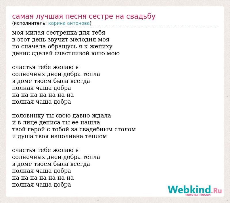 моя милая сестренка для тебя в этот день звучит мелодия моя но сначала обращусь я к жениху денис сделай счастливой юлю мою счастья тебе желаю я солнечных дней добра тепла в доме твоем была всегда полная чаша добра на на на на на на на полная чаша добра половинку ты свою давно ждала и в лице дениса ты ее нашла твой герой с тобой за свадебным столом и душа твоя наполнена теплом счастья тебе желаю я солнечных дней добра тепла в доме твоем была всегда полная чаша добра на на на на на на на полная чаша добра
