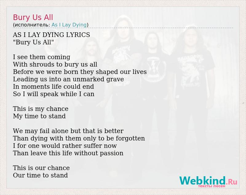 AS I LAY DYING LYRICS "Bury Us All" I see them coming With shrouds to bury us all Before we were born they shaped our lives Leading us into an unmarked grave In moments life could end So I will speak while I can This is my chance My time to stand We may fail alone but that is better Than dying with them only to be forgotten I for one would rather suffer now Than leave this life without passion This is our chance Our time to stand