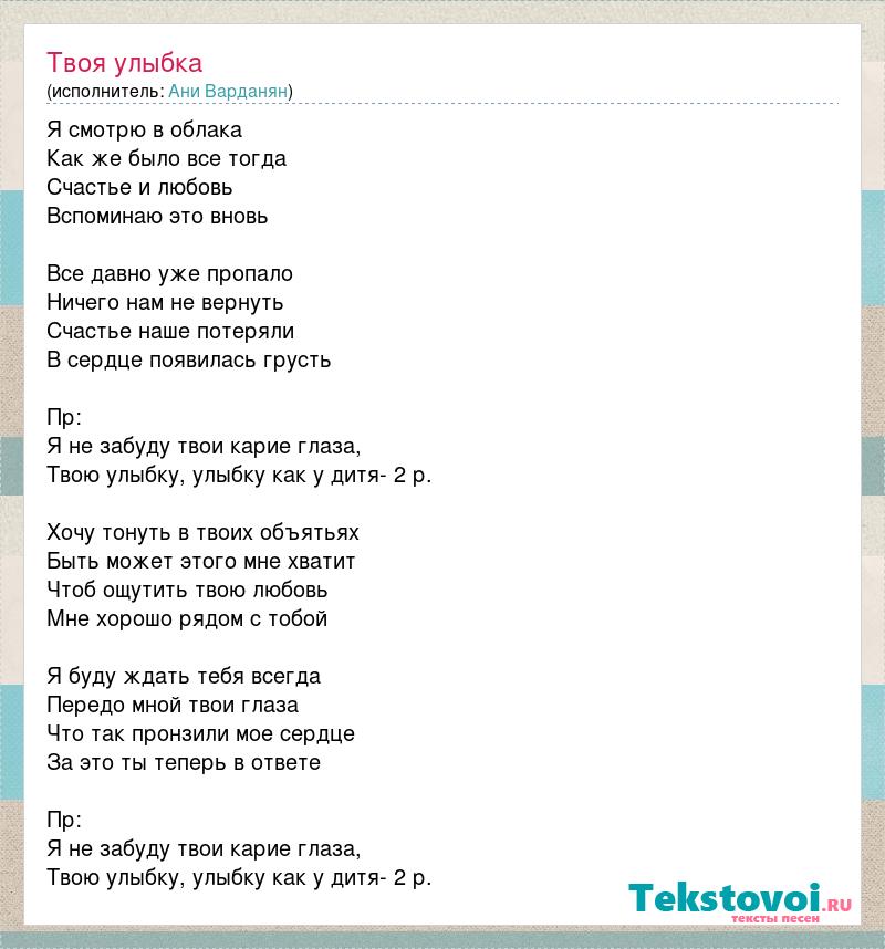 Я смотрю в облака Как же было все тогда Счастье и любовь Вспоминаю это вновь Все давно уже пропало Ничего нам не вернуть Счастье наше потеряли В сердце появилась грусть Пр: Я не забуду твои карие глаза, Твою улыбку, улыбку как у дитя- 2 р. Хочу тонуть в твоих объятьях Быть может этого мне хватит Чтоб ощутить твою любовь Мне хорошо рядом с тобой Я буду ждать тебя всегда Передо мной твои глаза Что так пронзили мое сердце За это ты теперь в ответе Пр: Я не забуду твои карие глаза, Твою улыбку, улыбку как у дитя- 2 р.